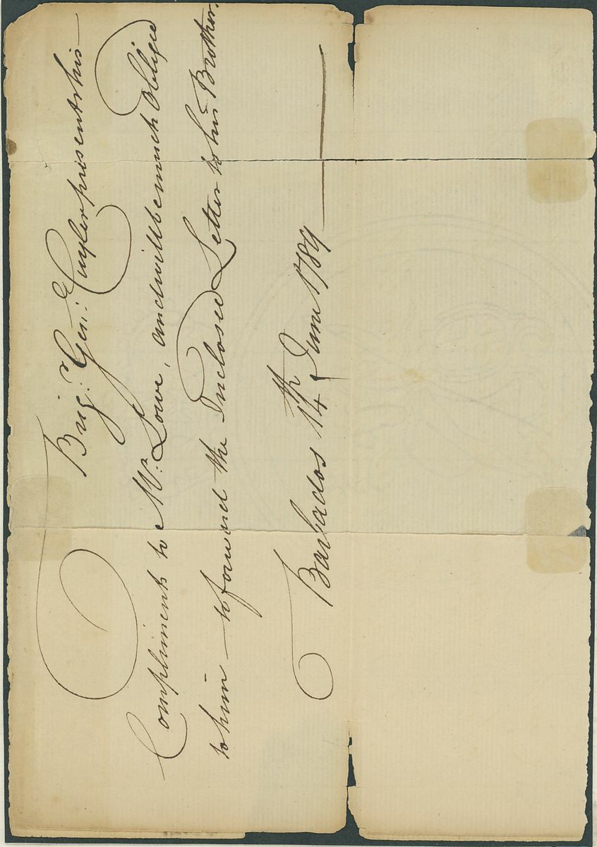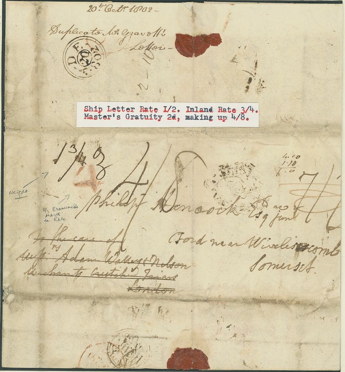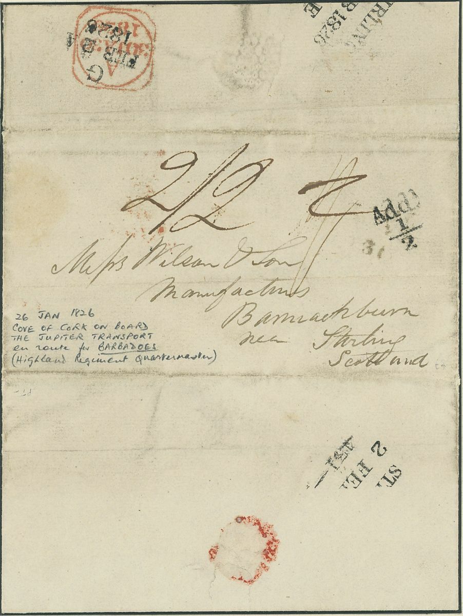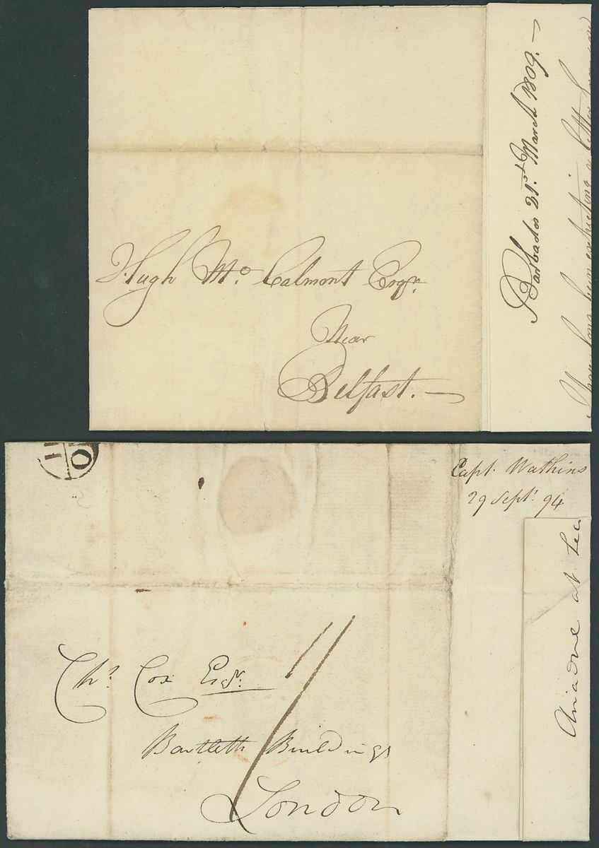 1879-1826 a small group of early letters (7) comprising 1789 (14 June) part letter (splits) from Brigadeer General Cuyler to Nicholas Lowe in New York, carried per Captain Burnet via Philadelphia; 1802 entire letter to Somerset rated 7/2, deleted and charges 4/8; 1809 entire letter carried privately to Belfast; 1826 entire letter carried aboard the Jupiter Transport to Sterling; also official documents given at the Court at Windsor (7) and letter from Barbados signed Combermere,  an interesting group.