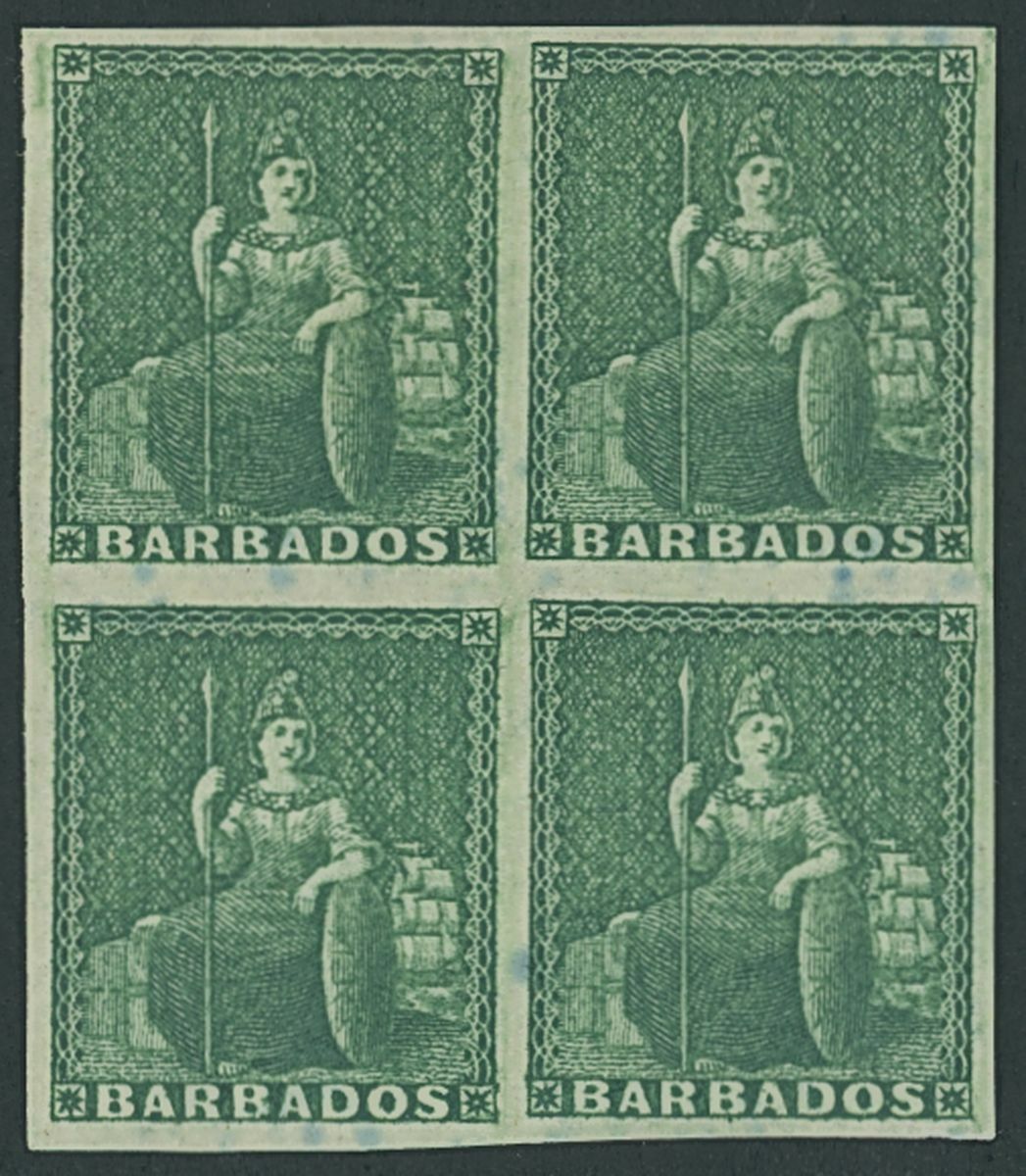 1852-55 (½d.) deep green block of four with good to large margins, large part original gum and fine. Initialled in pencil on reverse "A.D.". S.G. 2, £600