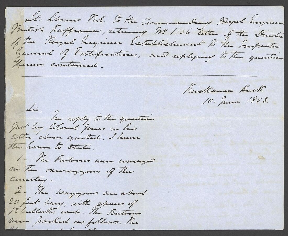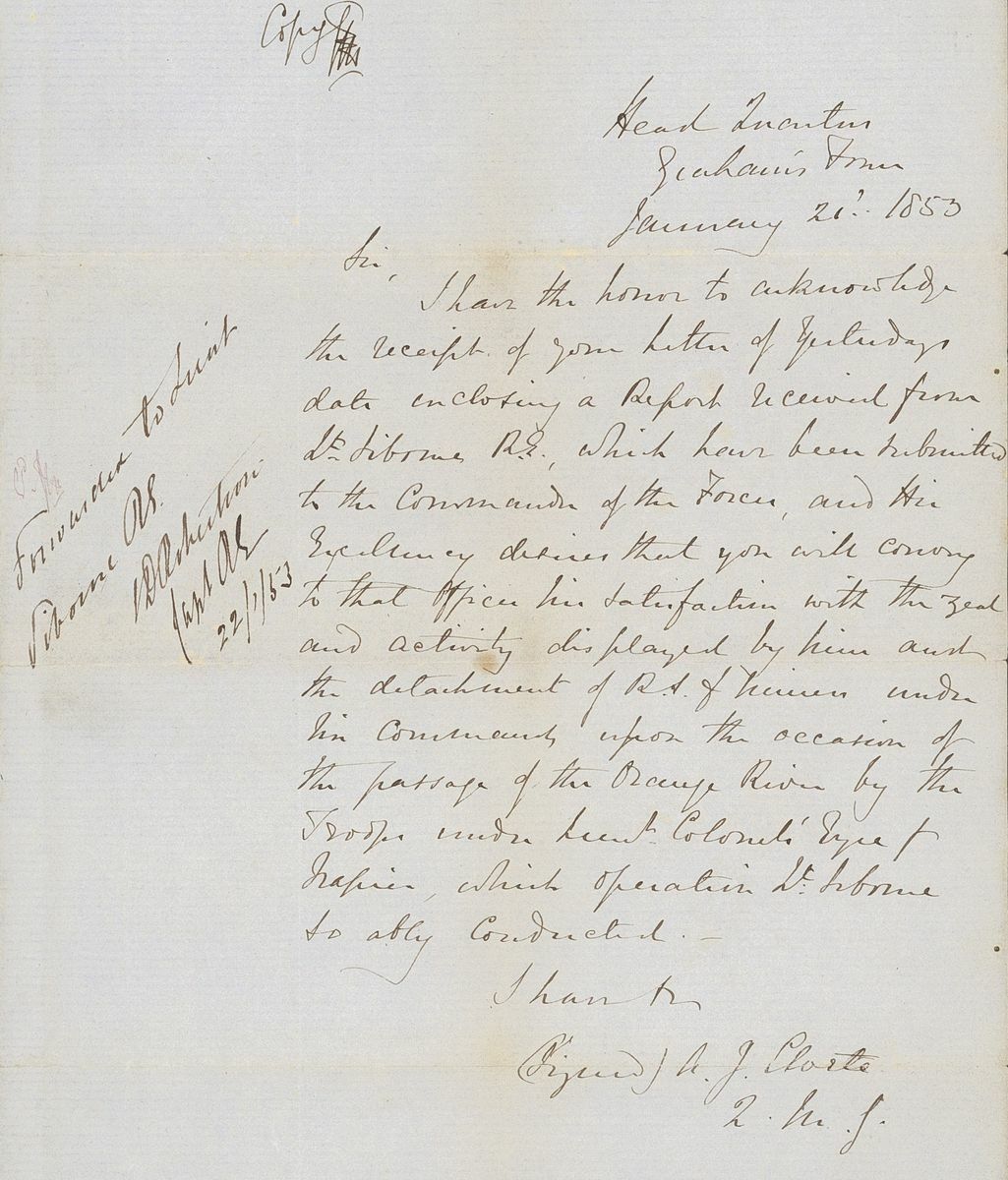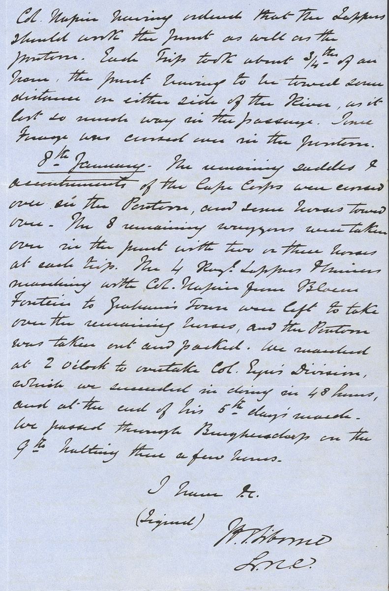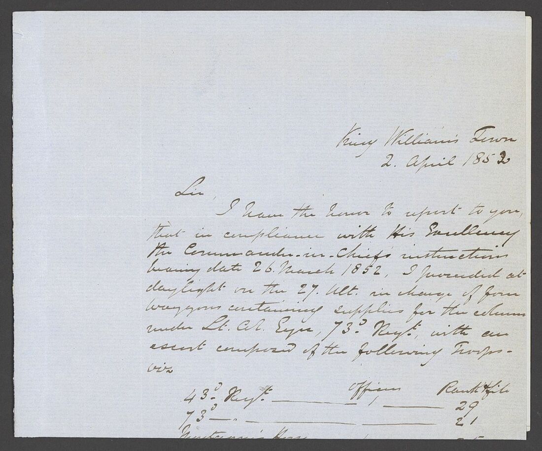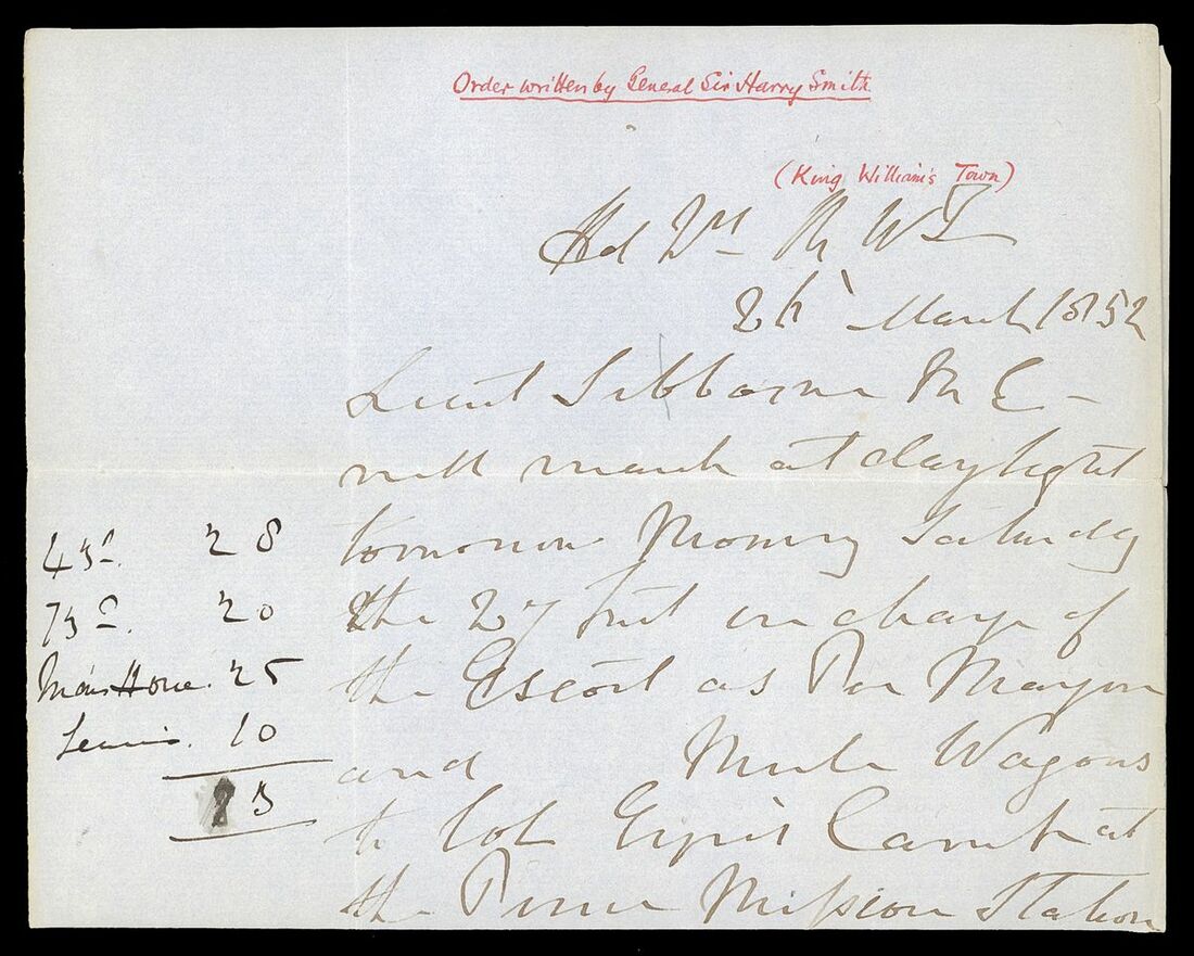 1852-54 copies of letters from Lt. Henry Siborne of the Royal Engineers, with 1852 (Apr.) from King Williams Town regarding an escort for wagons to Col. Eyre's column at Peri Mission Station accompanied by the original order signed by General Sir Harry Smith, 1853 (Jan.) letter from Camp near Kamastone giving an eight day diary of events of his detachment "attached to the expedition against Moshesh", 1853 (June) letter from Keishama Hoek giving details of improvements to the pontoons and two testimonials. A fine and historically interesting group
