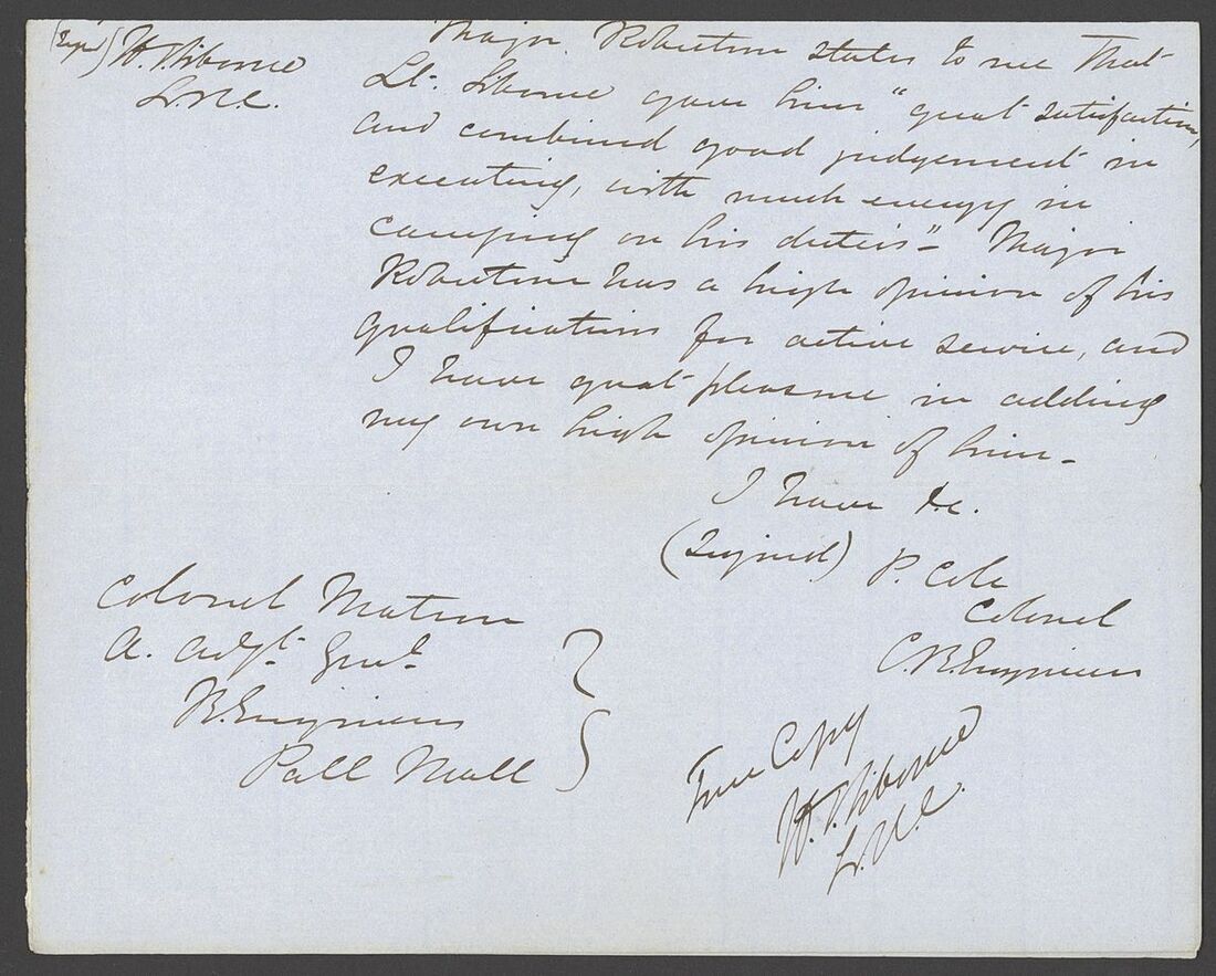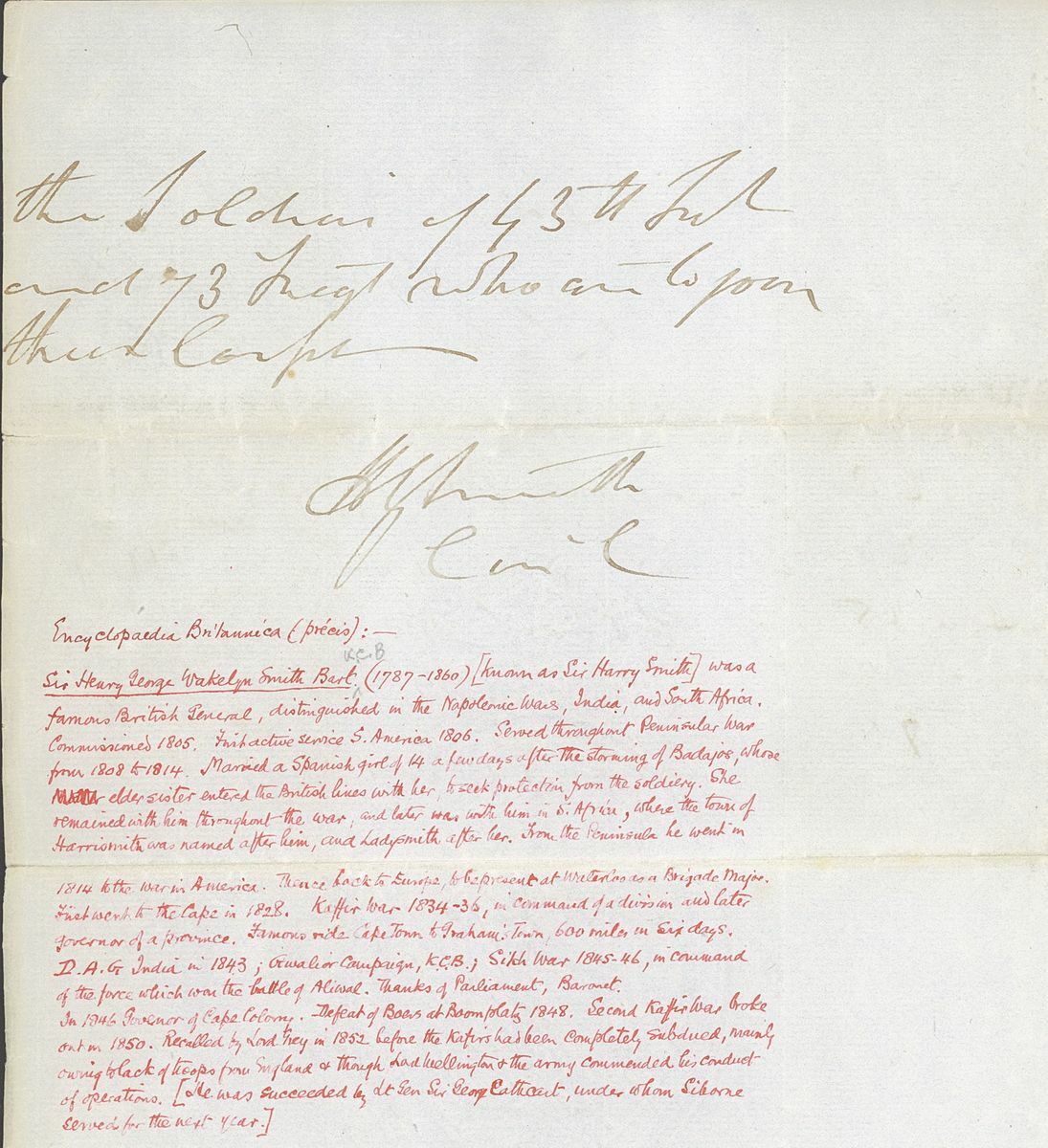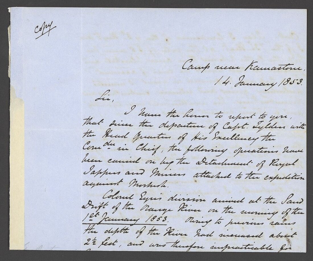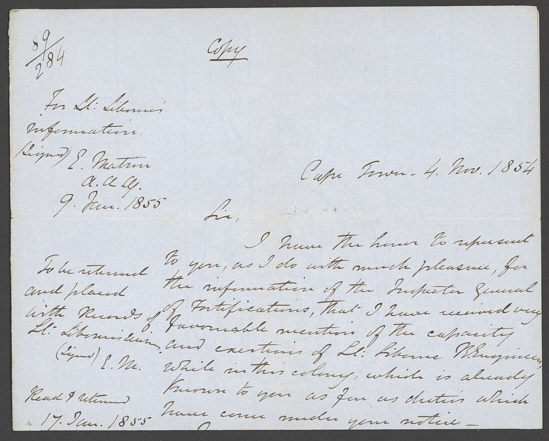 1852-54 copies of letters from Lt. Henry Siborne of the Royal Engineers, with 1852 (Apr.) from King Williams Town regarding an escort for wagons to Col. Eyre's column at Peri Mission Station accompanied by the original order signed by General Sir Harry Smith, 1853 (Jan.) letter from Camp near Kamastone giving an eight day diary of events of his detachment "attached to the expedition against Moshesh", 1853 (June) letter from Keishama Hoek giving details of improvements to the pontoons and two testimonials. A fine and historically interesting group