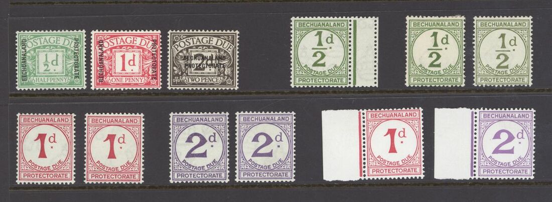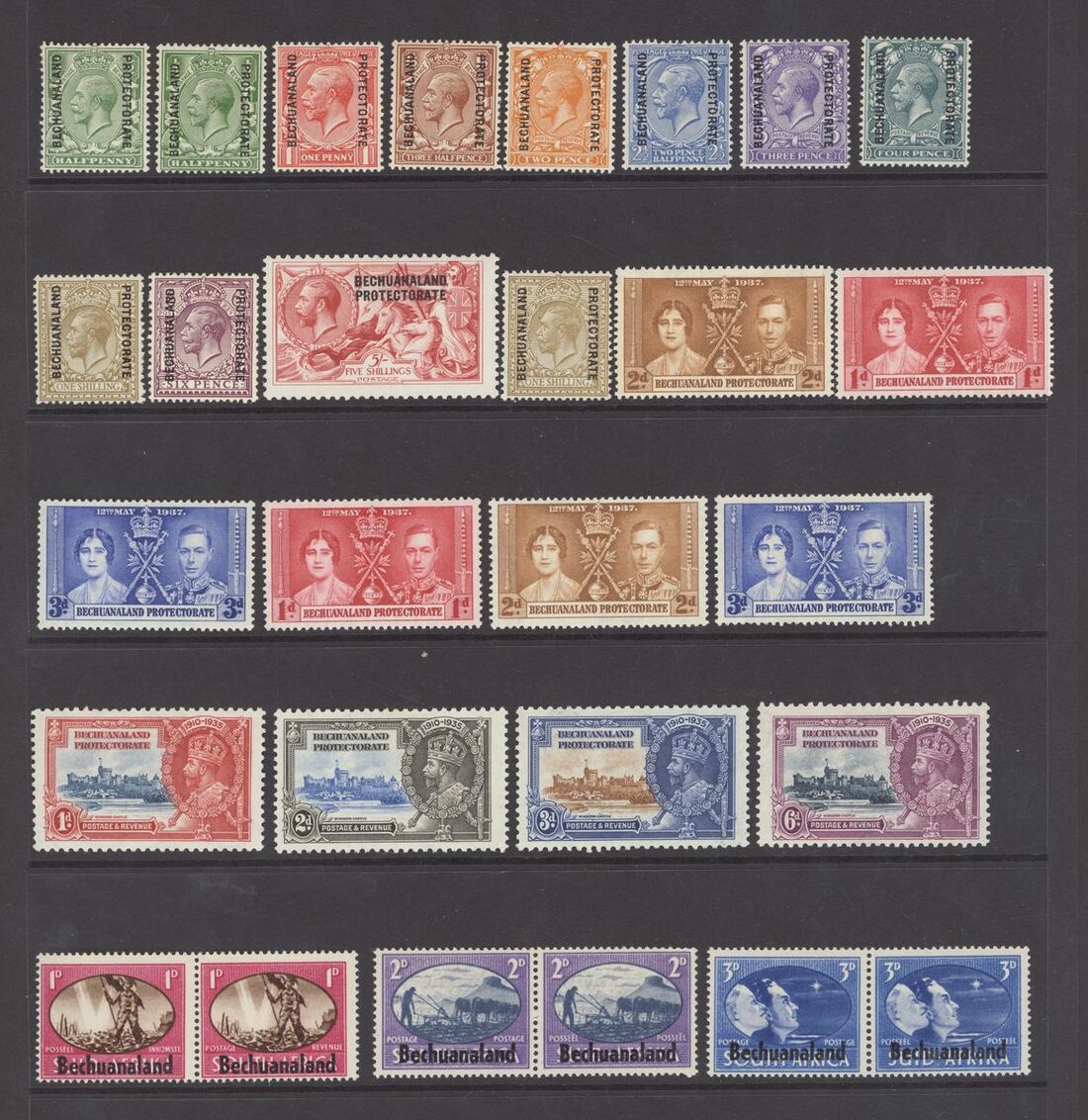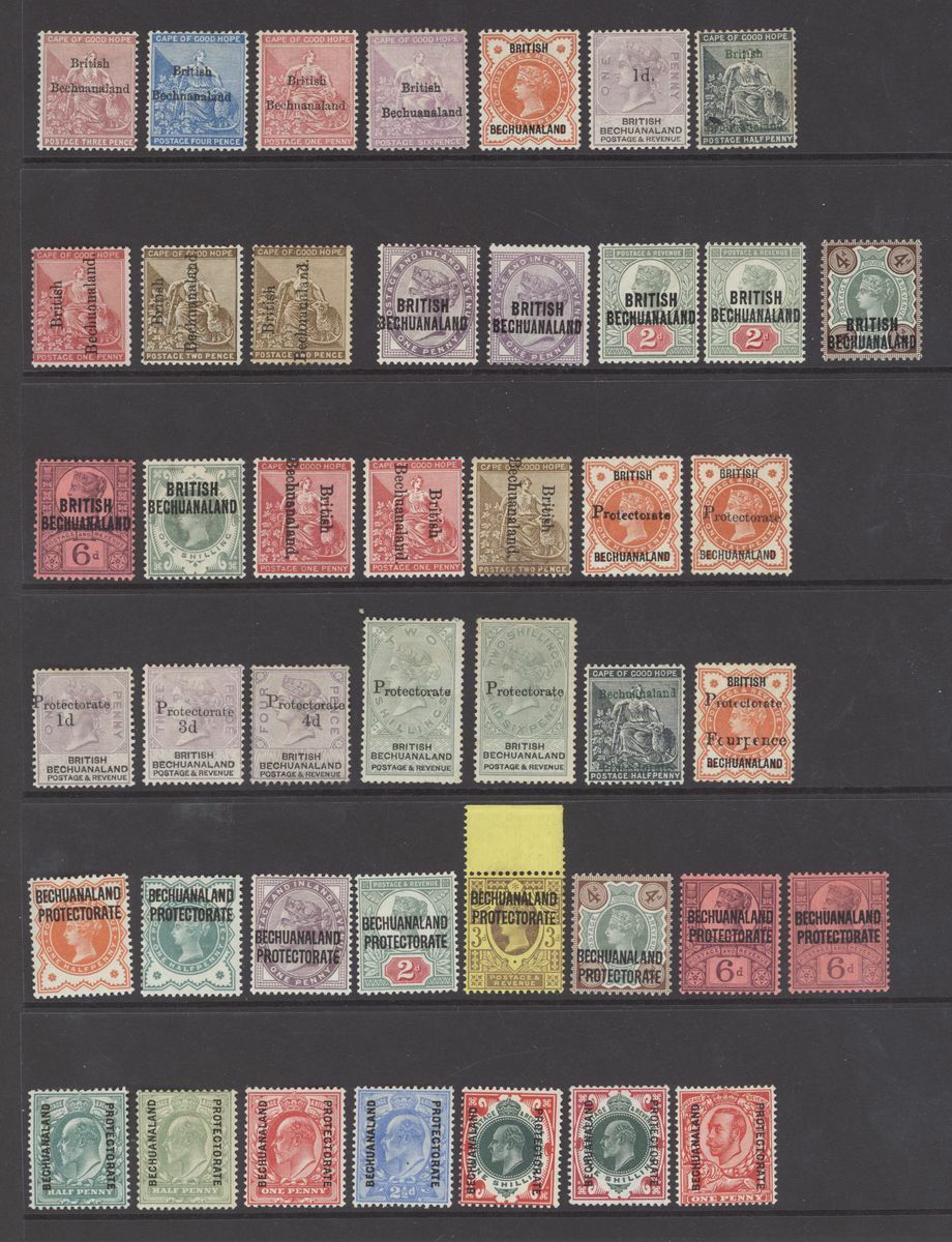 1885-1949 mint collection arranged on two Hagner pages including British Bechuanaland 1885-87 1d., 3d., 4d. and 6d., 1891-1904 1d. to 1/-, Bechuanaland Protectorate 1888 (Aug.) 3d. on 3d., 4d. on 4d., 2/- (fair) and 2/6d. (fair), 1889 (Mar.) 4d. on ½d., 1897-1902 ½d. (both) to 1/-, 1904-13 1/- (2), 1913-14 ½d. to 1/- and DLR 5/-, 1932 ½d. to 10/- and 1938 ½d. to 10/-, fine. Cat. £4,000+