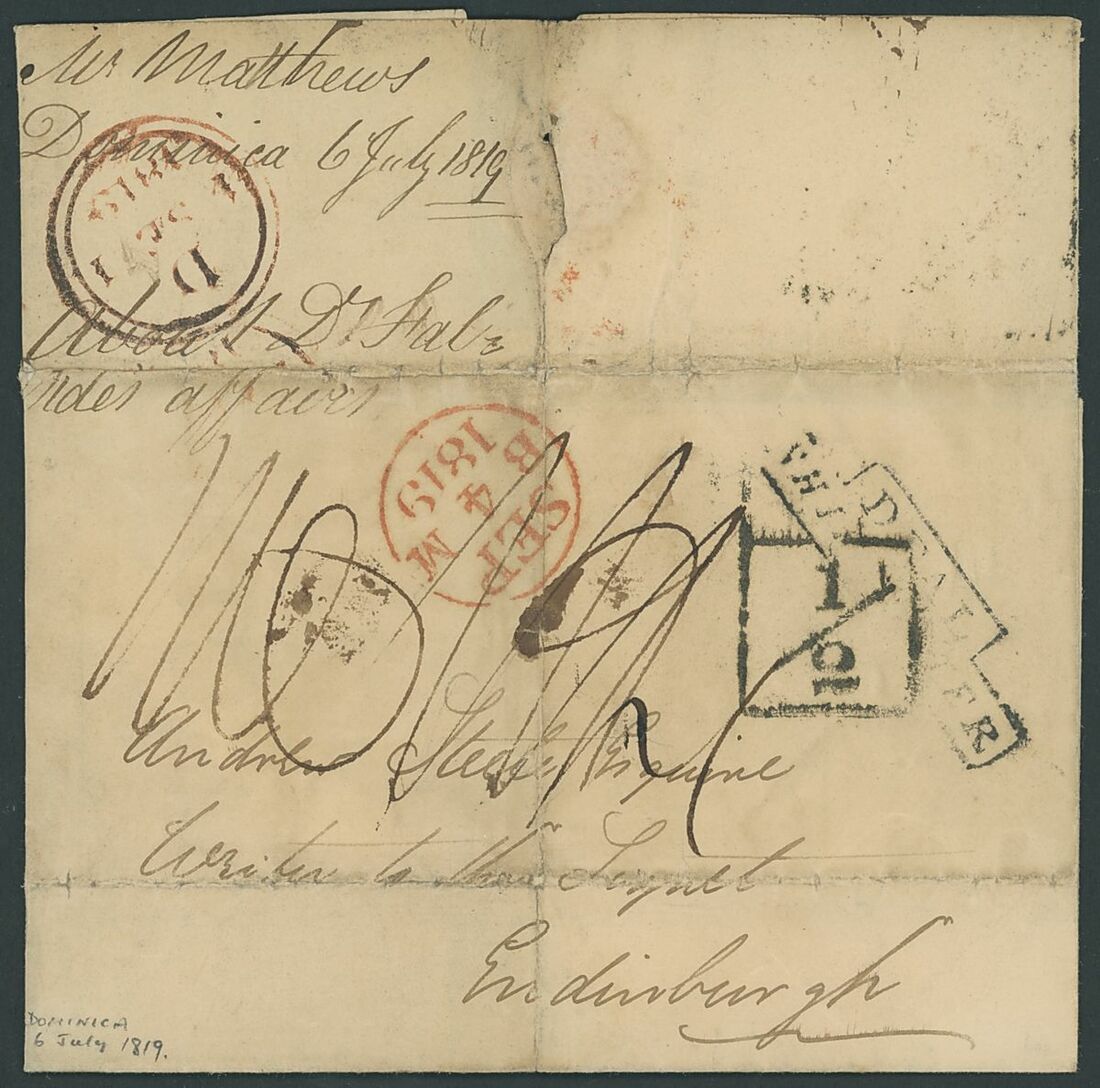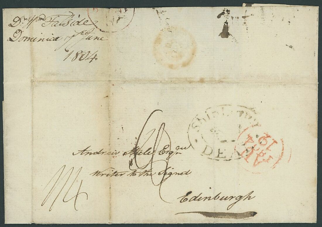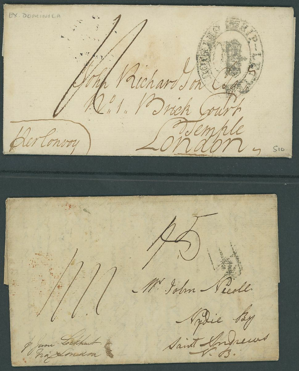 1804-35, eight entire letters to London or Scotland with ship letter markings, including 1804 with oval Ship Letter/Deal, 1819 with red step type Falmouth/Ship Letter, 1819 with step type Deal/Ship Letter, 1831 with step type Ship Letter/Cowes (across flap), 1835 with framed Liverpool/Ship Letter, etc., mixed condition