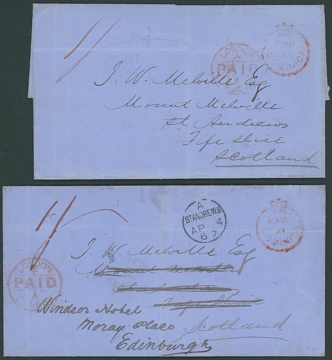1866 (26 Sept.) and 1867 (13 March) entire letters, ex the Melville correspondence to Scotland (the second re-directed from Fifeshire to Edinburgh), each with good to fine red Crowned circle "