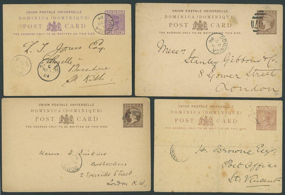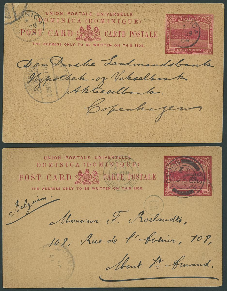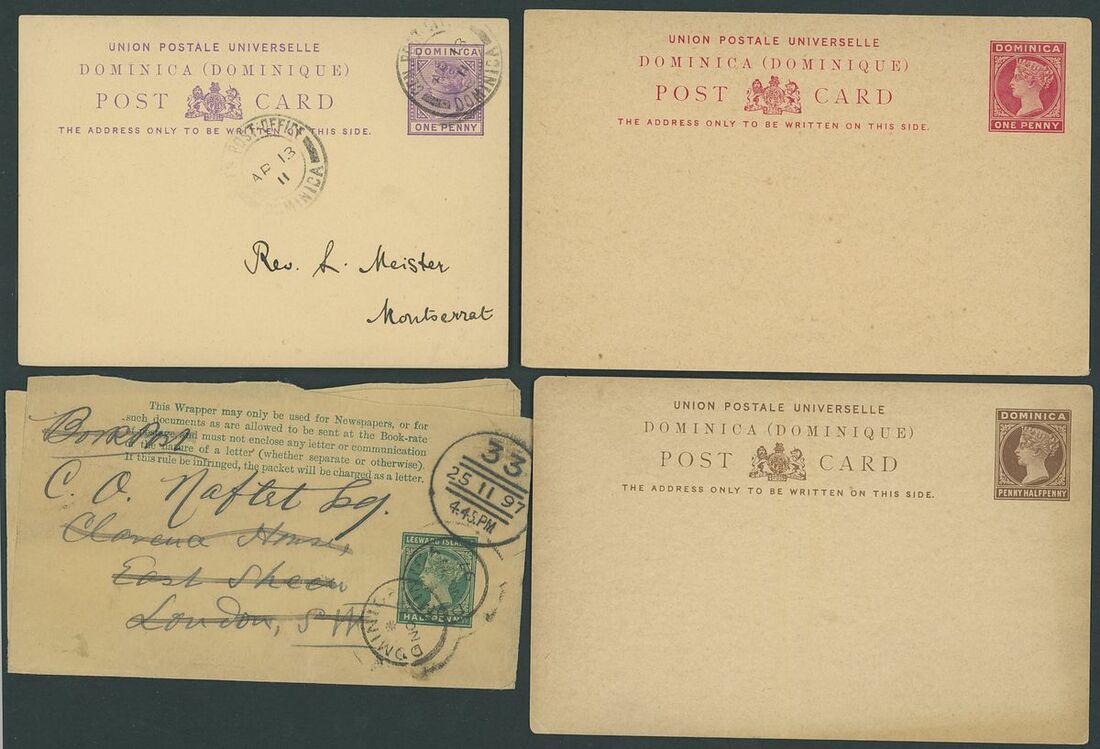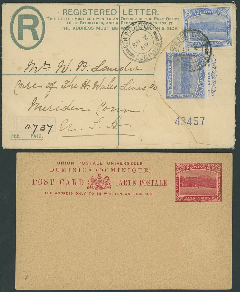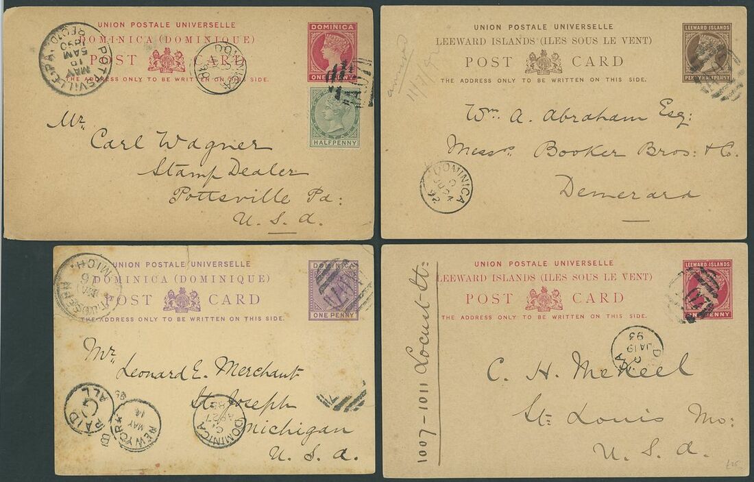 Unused and used selection (22 items), including postcards with 1884 1d. violet used to St. Kitts, 31890 1d. red additionally franked ½d., 185 1½d. brown used to St. Vincent, 1904 pictorial 1d. used to Denmark, reply paid cards, wrappers, envelopes, Registered envelopes 1909 2d. additionally franked 2½d., etc., also Leeward Islands 1900 1d. envelope used from Dominica to Cambridge; mixed condition