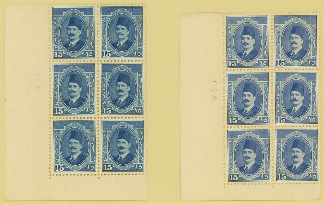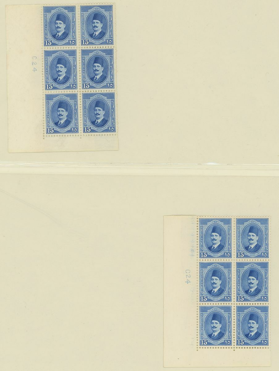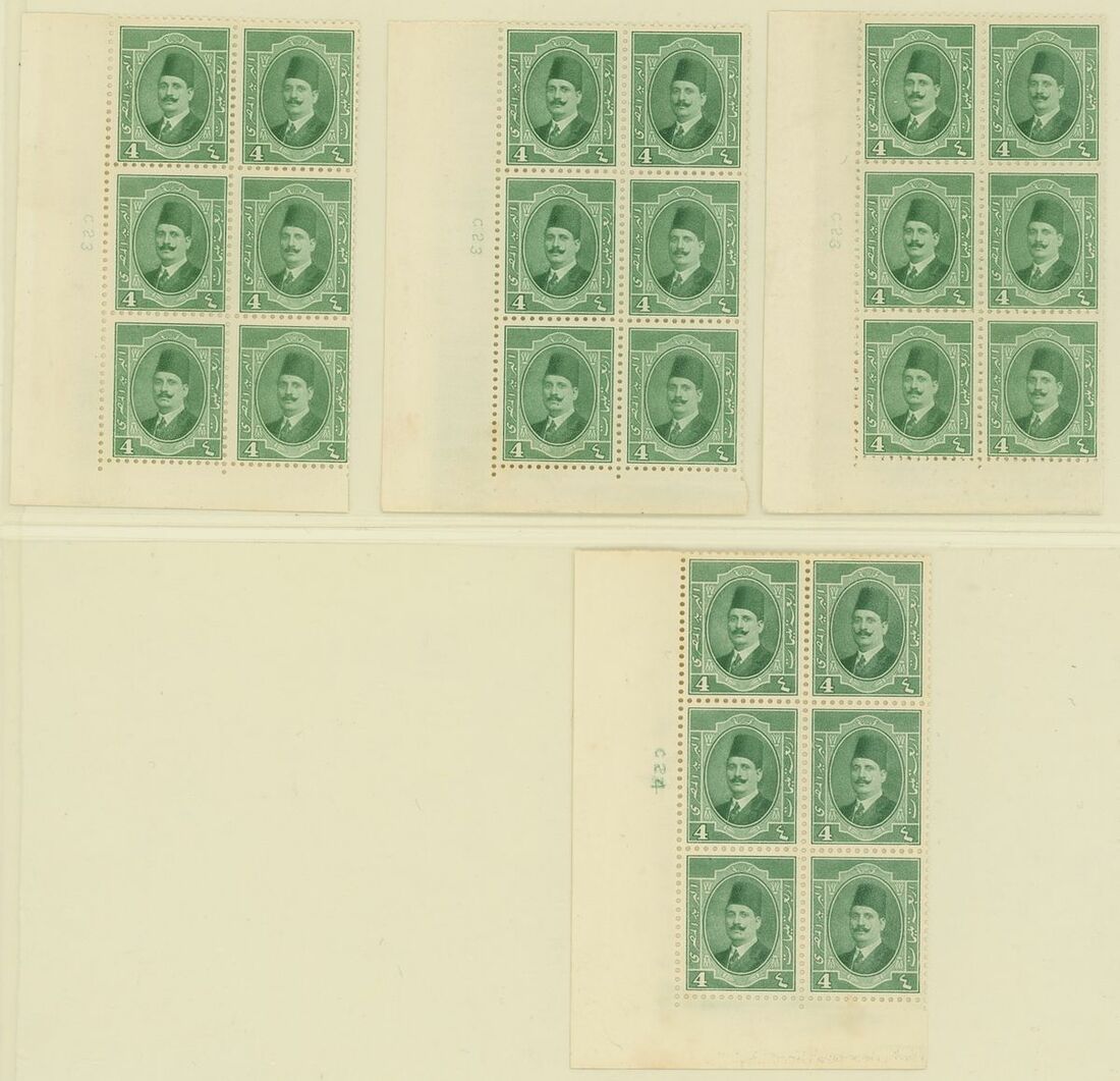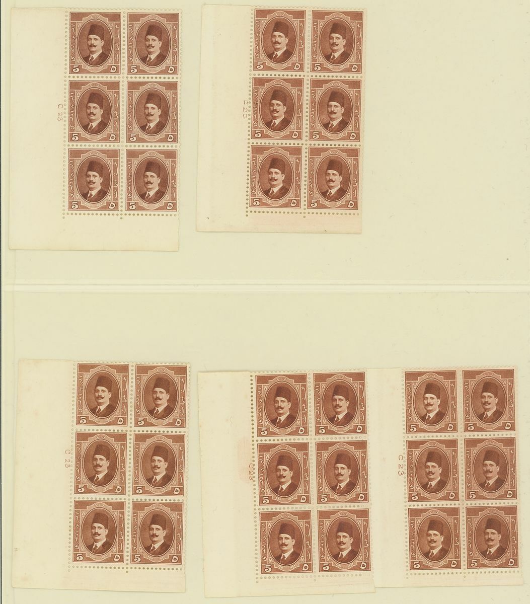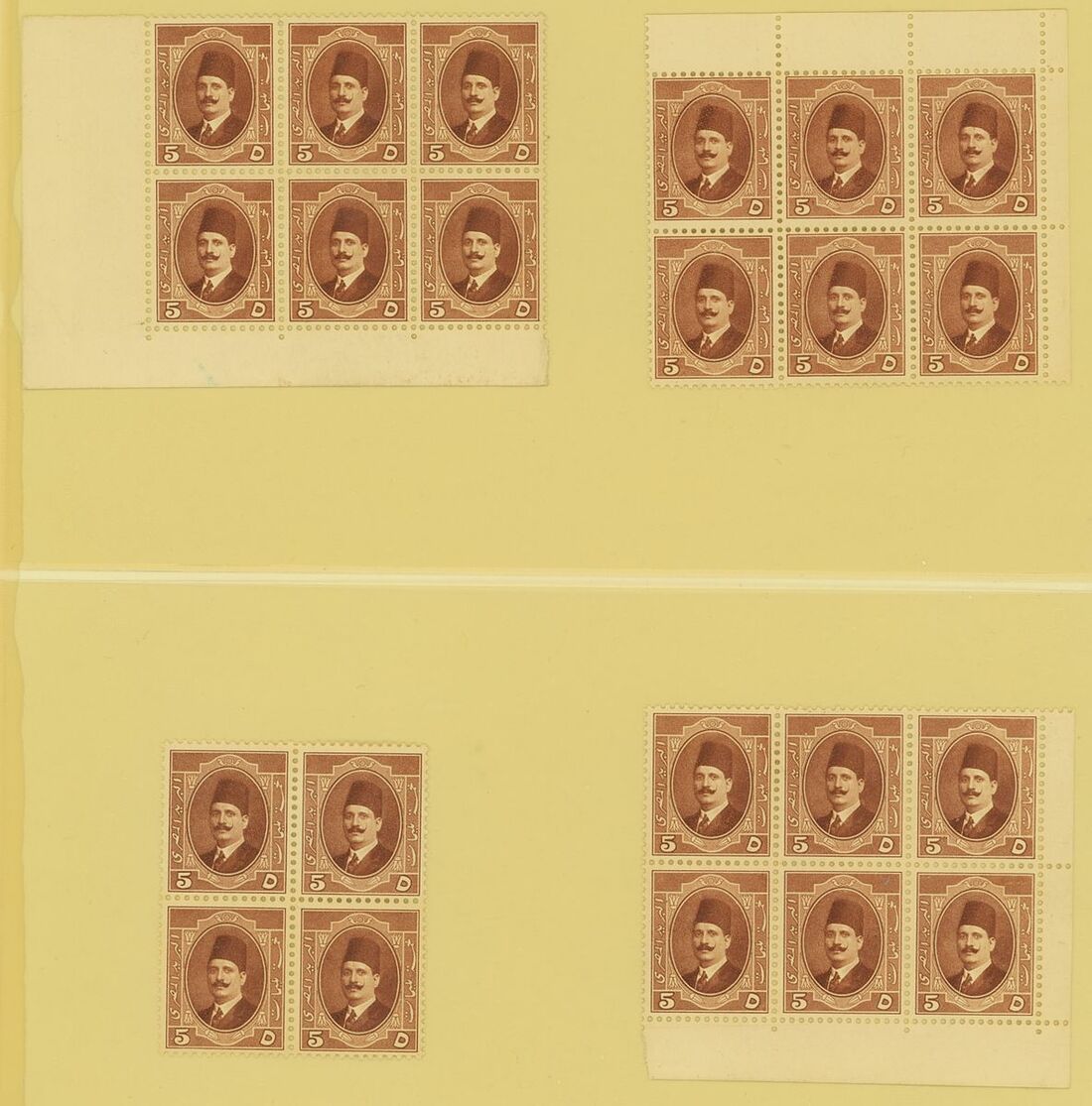 1923-24 King Faud I mint group on stock pages, mostly in corner blocks of six (2x3) showing control numbers including 2m. (6), 3m. (3), 4m. (5) with corner block of twelve, 5m. (13), 10m. (2), 15m. (4). S.G. 112-117, £350