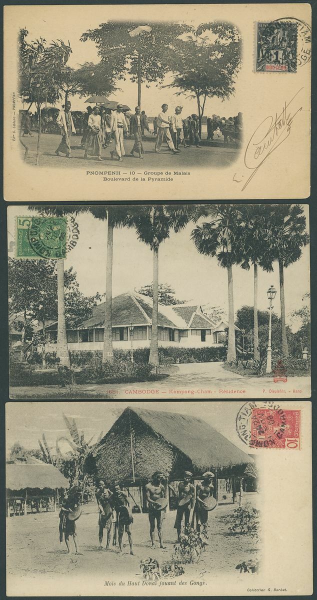 1904 picture postcard to Paris franked at 1c., 1908 (24 Nov.) picture postcard to Paris franked at 10c. and 1908 (22 Dec.) picture postcard to Hanoi franked at 5c., all tied by