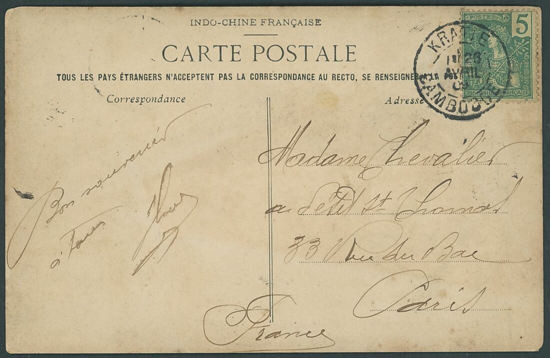 1909 (26 Apr.) picture postcard to Paris, franked at 5c. and tied by