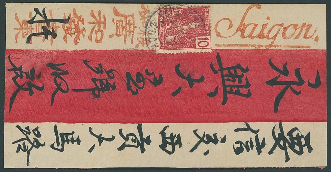 1907 (Aug.) "red band" envelope (opened-out) to Saigon, bearing 10c. tied by