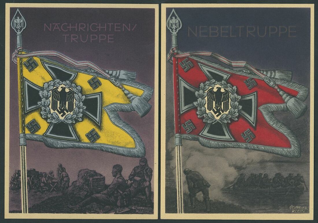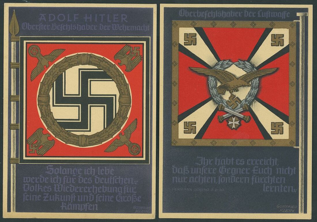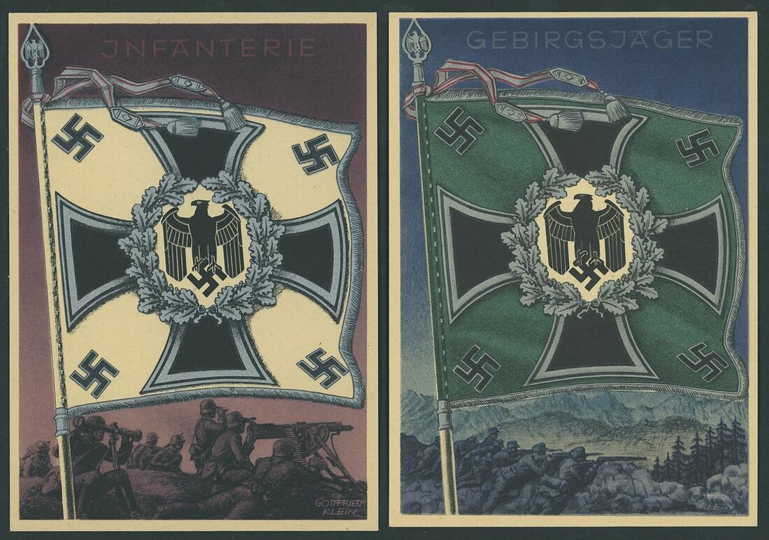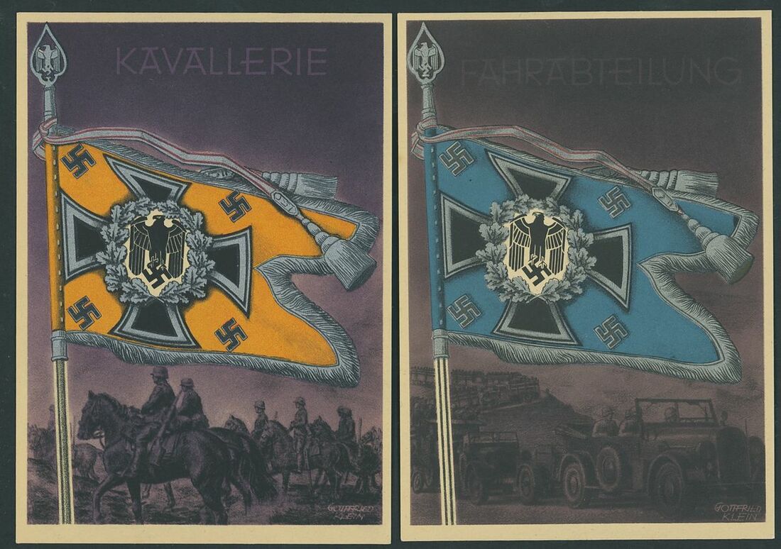 1942 'Die Siegreichen Fahnen und Standarten der Deutschen Wehrmacht' (The Victorious Flags and Standards of the German Wehrmacht) complete set of twenty one unused postcards plus the original folder by artist Gottfried Klein, slightly mixed condition though a very rare complete set.