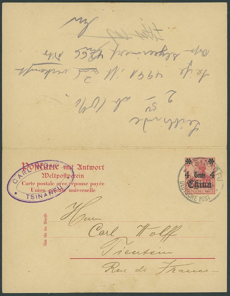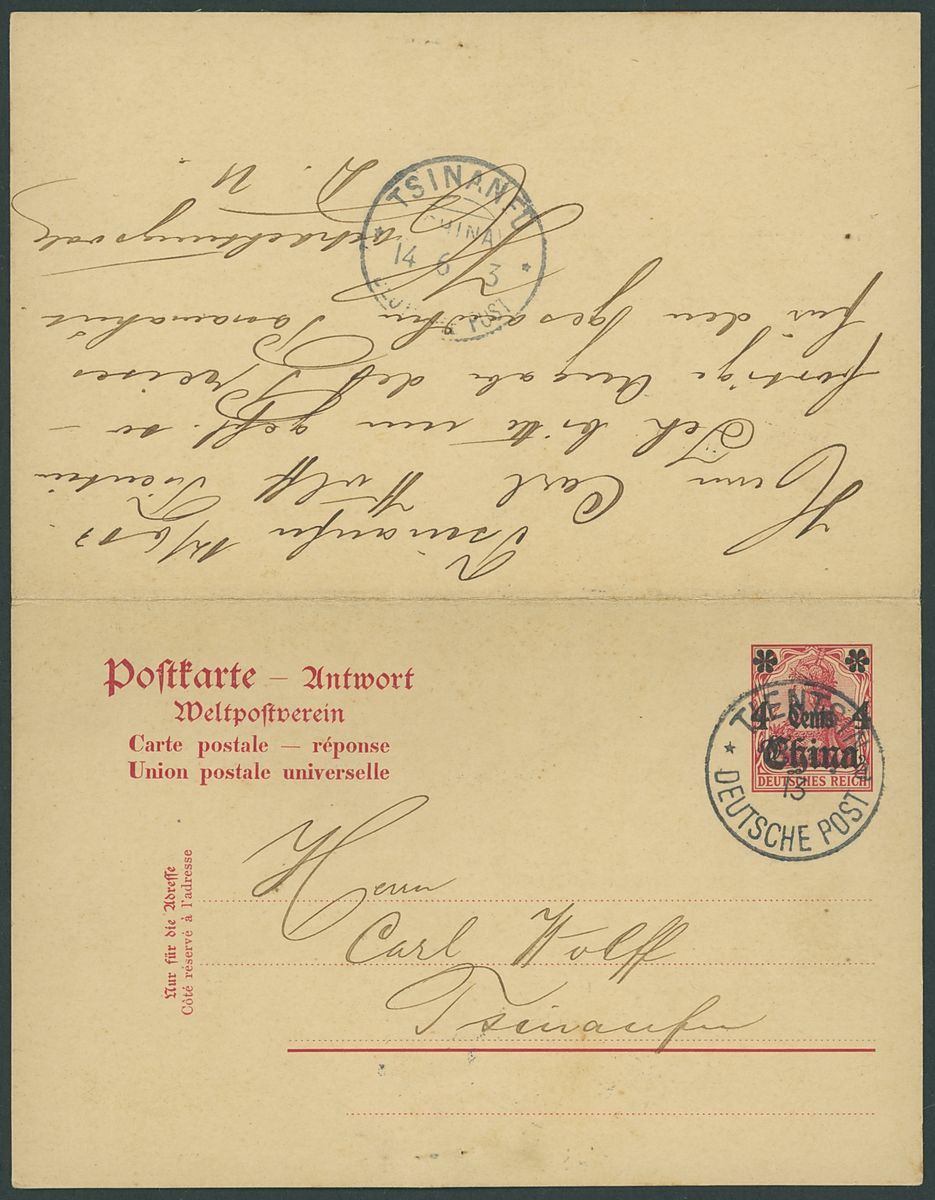 1913 (12 June) 4c. on 10pf. reply card sent from Carl Wolf, Tsinanfu to Tientsin cancelled by the despatch c.d.s.; the reply section cancelled by Tientsin c.d.s. and with Tsinanfu arrival on the reverse (14.6). Fine and a very rare complete reply card properly used