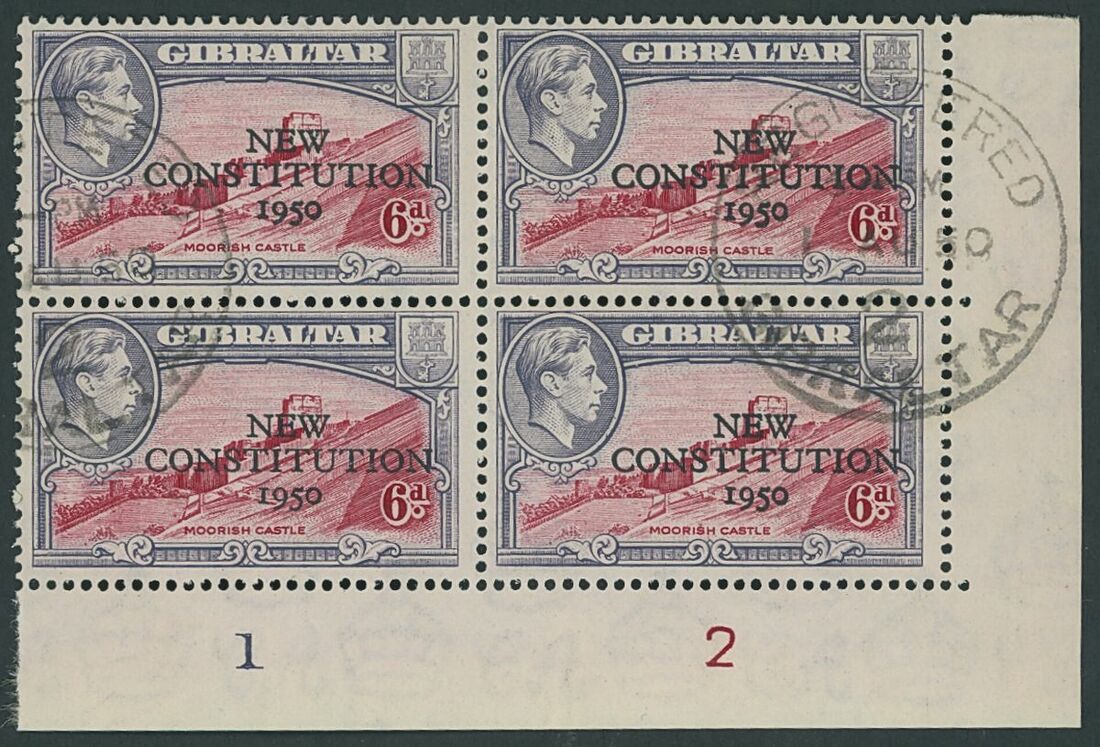 1950 6d. carmine and grey-violet corner marginal block of four from the lower-right of the sheet, each stamp showing variety overprint double, cancelled by registered / Gibraltar d.s. 01.08.50; some paper adhesion confined to the margin only otherwise fine used and a very rare multiple. KGVI Expertising Certificate (2009). S.G. 142a, £5,200