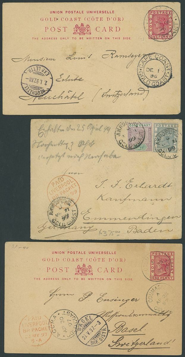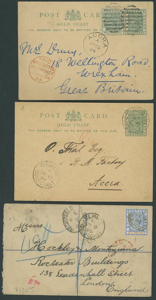 1894-99, six covers or cards, including 1894 ½d. card, uprated with ½d. from Accra to Wrexham, 1894 ½d. card from Odumasie to Accra, 1895 2d. Registered envelope, uprated with 2½d. from Elmina to London, 1896 1d. card from Kumasi to Switzerland, 1899 envelope franked ½d., 2d. from Akropong to Germany, etc., good to fine