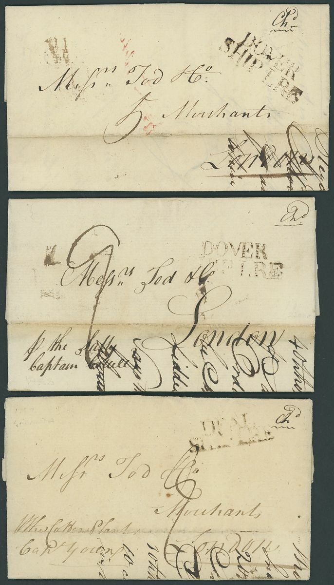 1787 (2) and 1788 entire letters, ex the Tod correspondence to London, Dover or Deal Ship letter markings, the last with fine