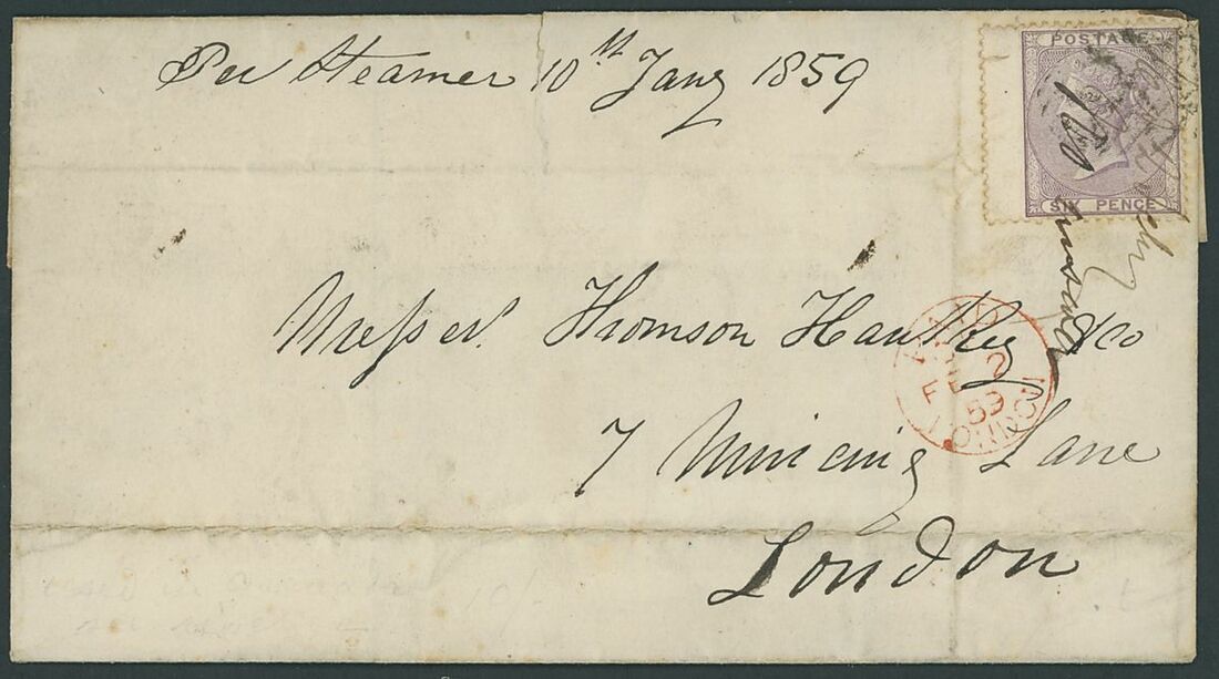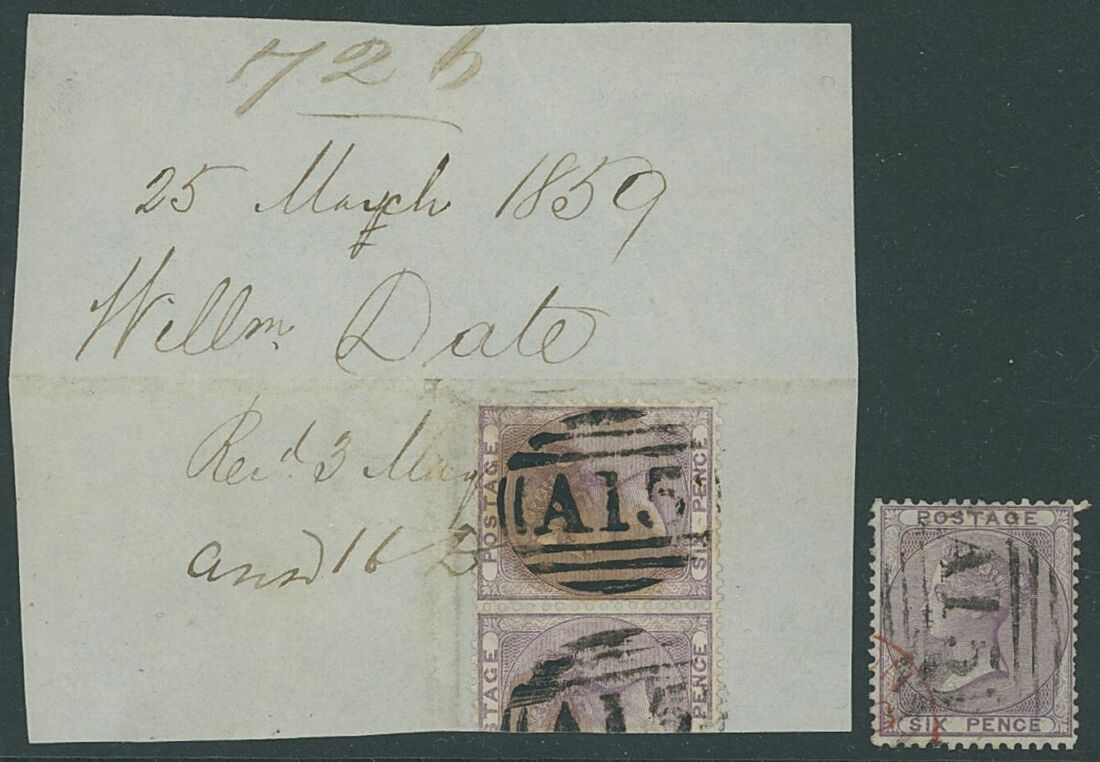 1856 6d. with complete "A15" barred oval, also piece bearing 6d. (and half of another) similarly cancelled, also 1859 (Jan.) entire to London franked 6d. (wing margin) tied by manuscript datestamp and with Grenada c.d.s. (10.1) on reverse; some faults