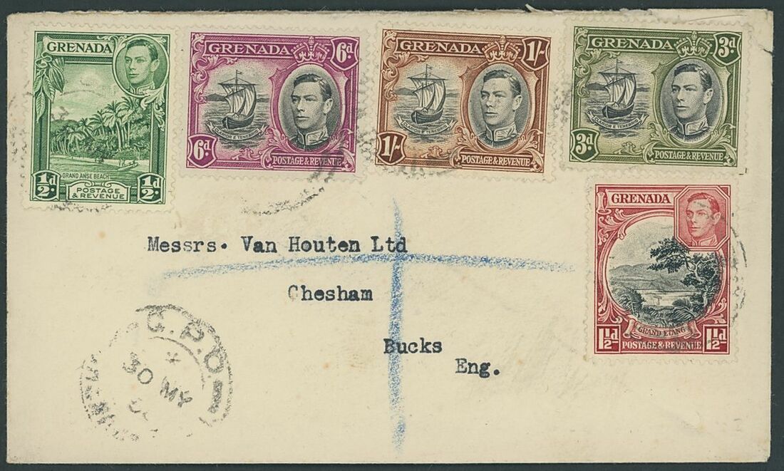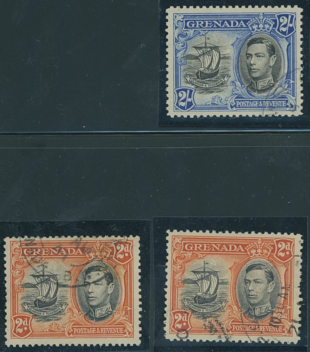 1938-50 1d. (vertical pair from the upper left corner of the sheet), 1/- (on cover to England with ½d., 1½d., 3d. and 6d.) , 2/- , all showing the line on sail repaired variety, 2d. (2 used) each showing extra window and broken handrail variety; fine S.G. 154, 160, 161 vars., 156ab