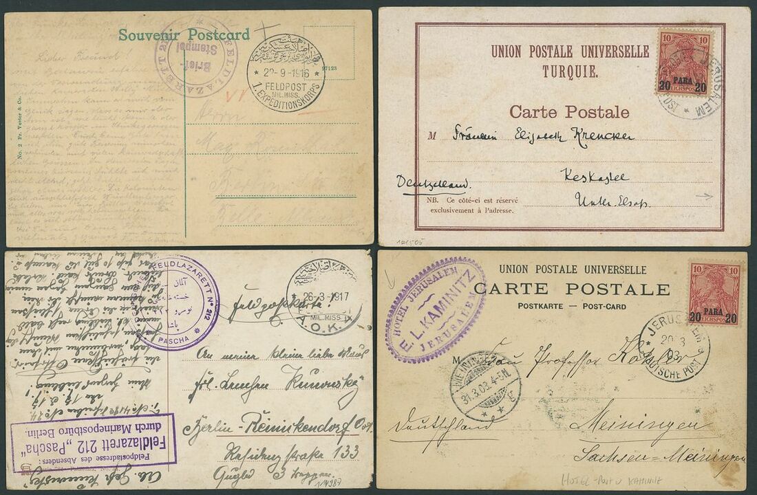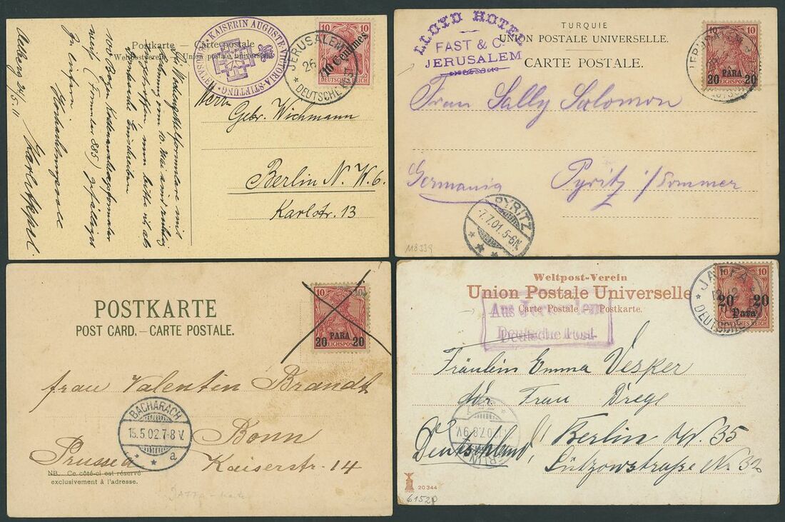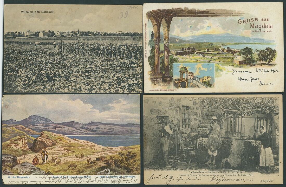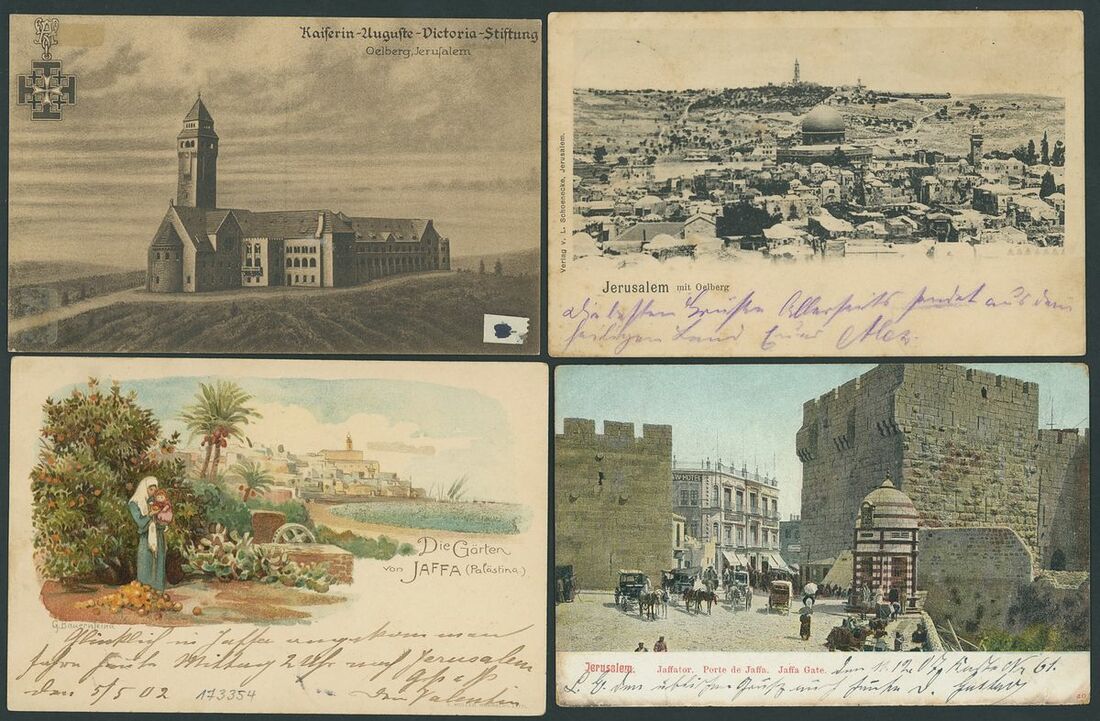 1901-17, selection of eight picture postcards, mostly coloured, cancellations with Jaffa, Jerusalem, markings with violet boxed "Aus Jerusalem/Deutsche Post",