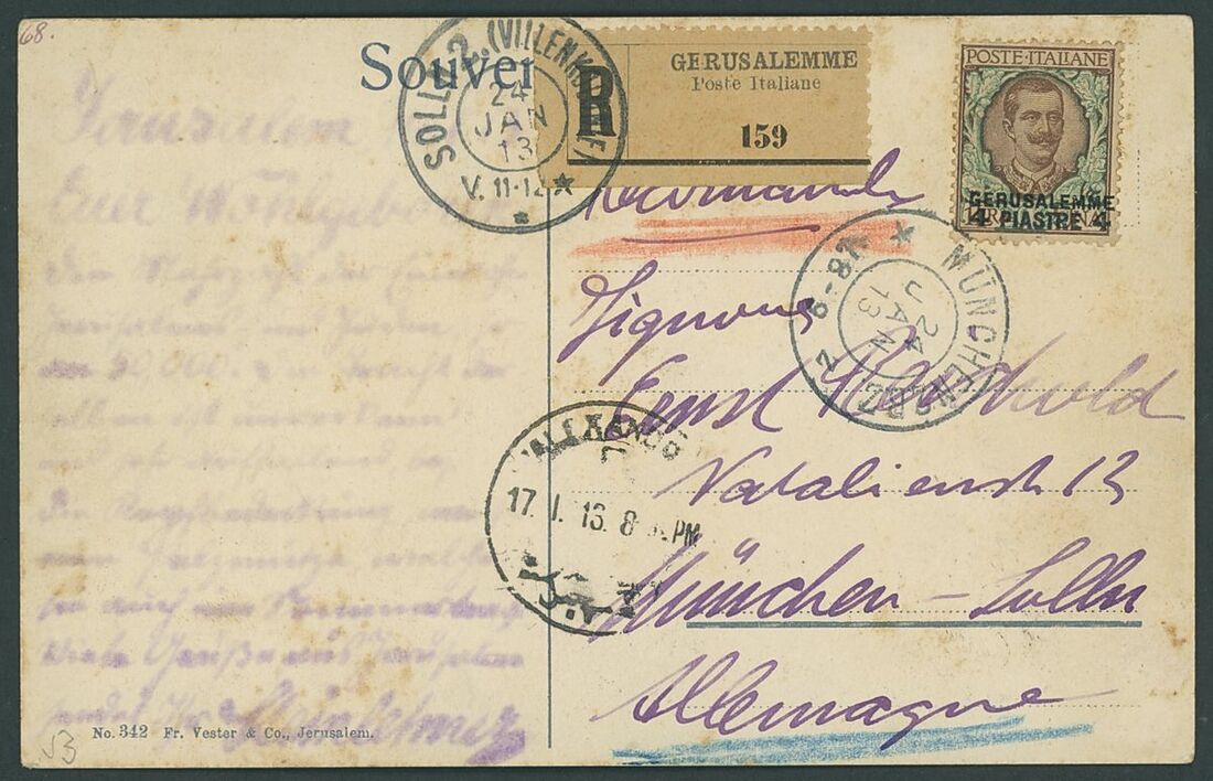 1913 (17 Jan.) coloured picture postcard registered to Munich, bearing Gerusalemme 4pi. on 1L. tied by Munich arrival c.d.s.; some minor staining but very rare. S.G. 130
