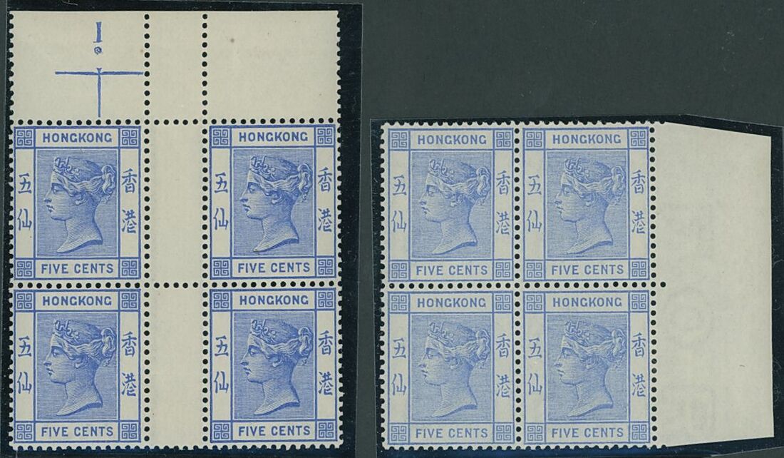 1882-96 CA 5c. pale blue, block of four from the right of the sheet and 5c. blue, interpanneau block of four from the top of the sheet with printer's guide mark at upper left; both with full original gum, fine. S.G. 35, 35a