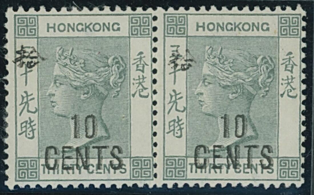 1898 (1 Apr.) 10c. on 30c. grey-green, horizontal pair showing surcharge with a distinct kiss-print resulting in a very striking 'shadowed' surcharge at foot; light diagonal bend at lower right not affecting the appearance, large part original gum. S.G. 55 var.