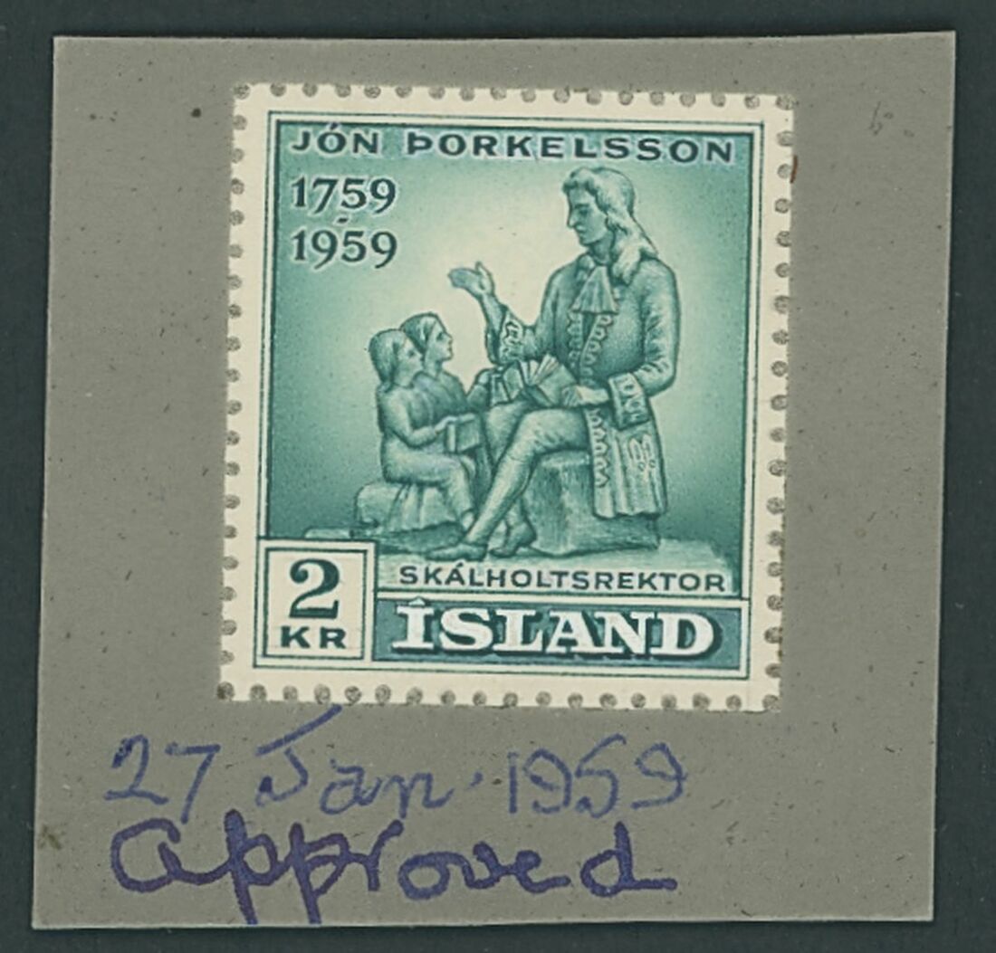 1959 Jón Thorkelsson 2k. handpainted essay in blue-green and Chinese white on card, marked "27 Jan. 1959" and "Approved";  fine and unique. Christie's Robson Lowe Certificate (1993). S.G. 364.