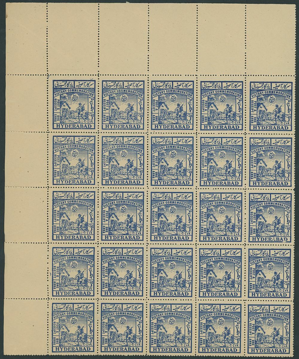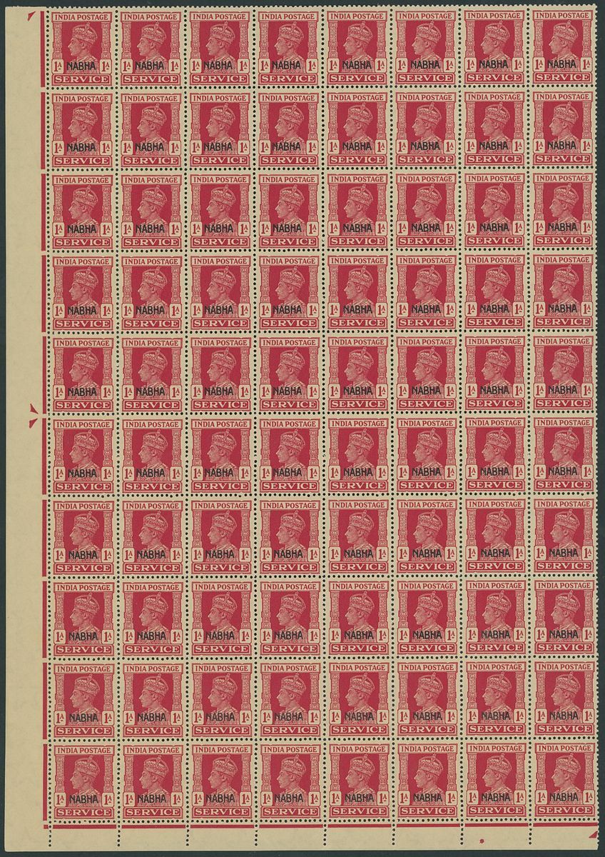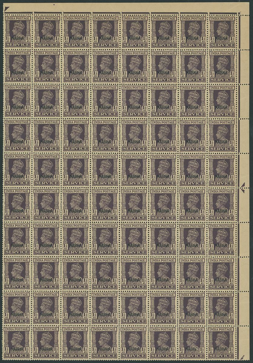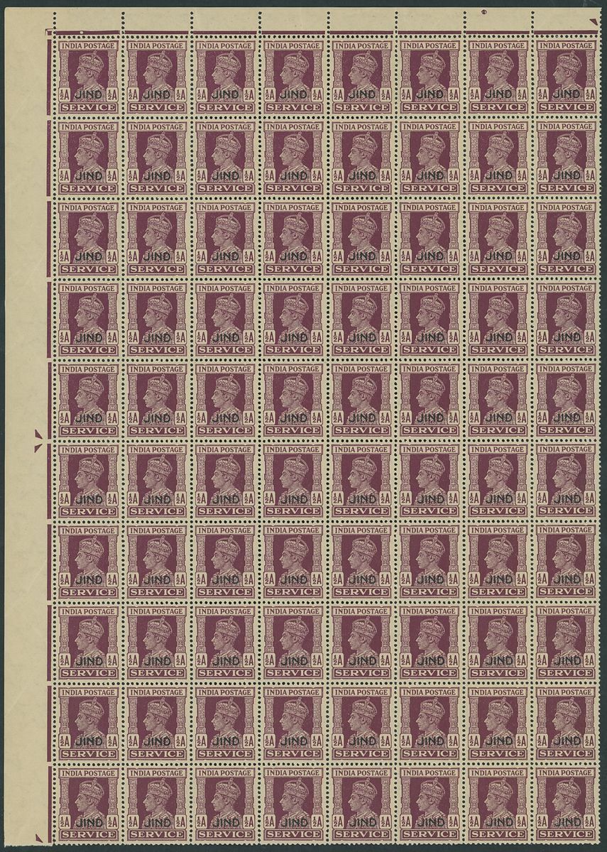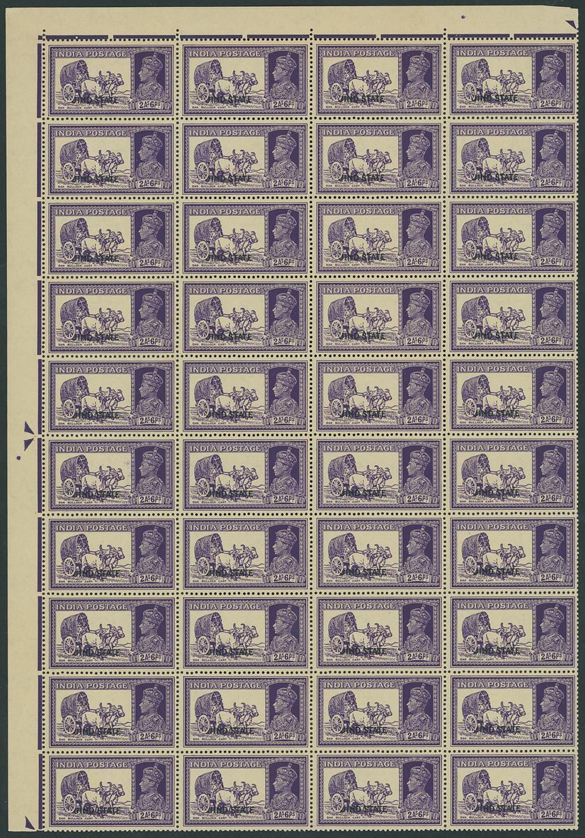 1937-40 2a.6p. blocks of thirty-two and forty, Jind 1939-43 Service ½a. red-brown and 9p. green block of eighty, Nabha 1940-43 Service 1a. carmine and 1½a. dull violet blocks of eighty and Hyderabad 1945 Victory 1a. blue complete sheets of 100 (3) plus some other multiples; generally good to fine