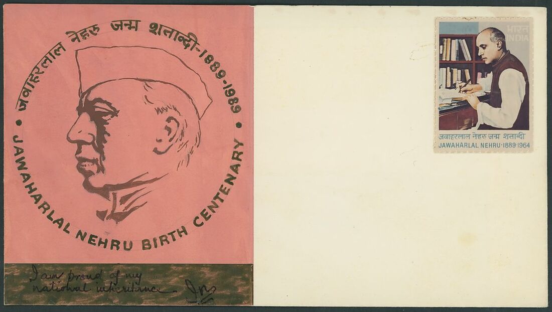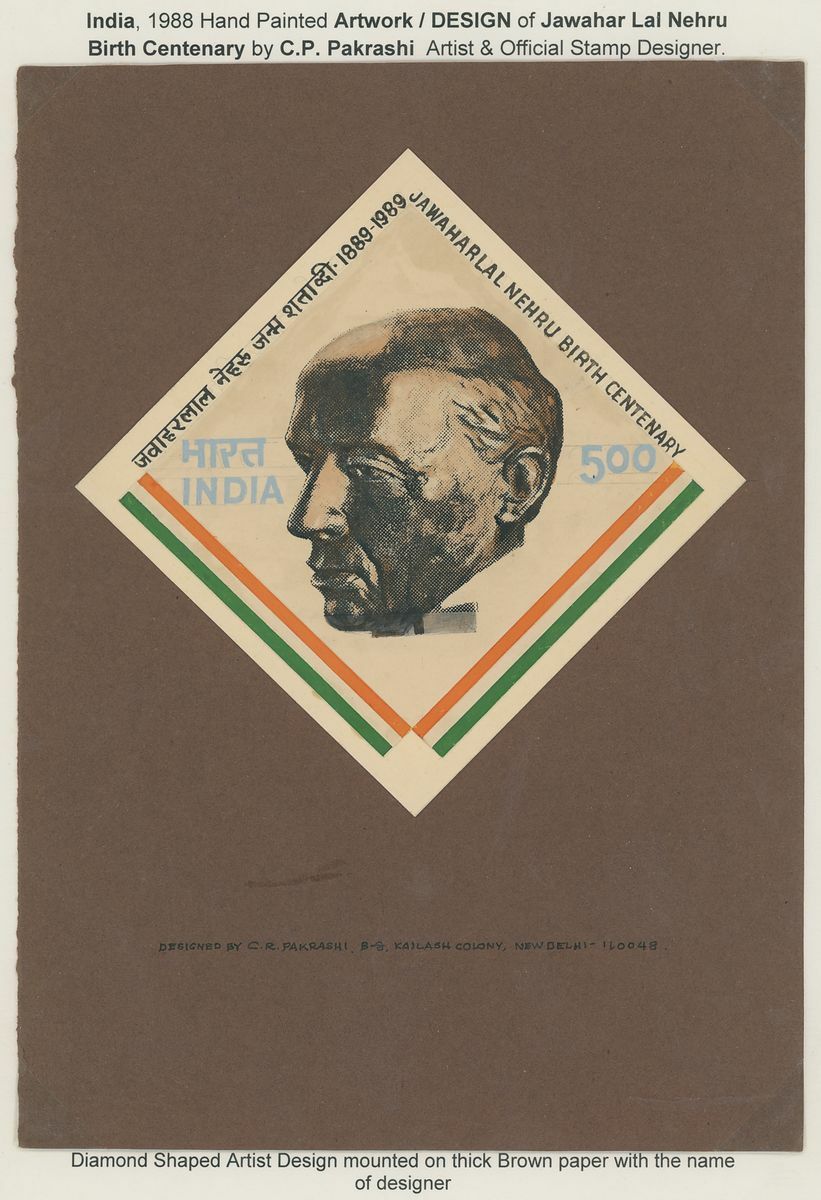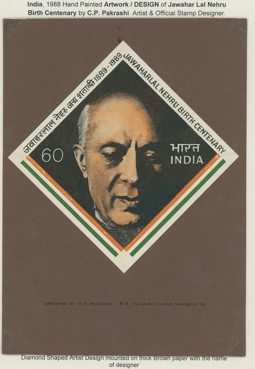 1988 Jawahar Lal Nehru Birth Centenary, an archival collection written up on pages of original artwork and essays over six different designs, all by C. R. Pakrashi including large handpainted essays (6), mostly affixed to card, many with photographic essay of the same design, handpainted essay depicting Nehru writing at a desk (175x128mm.) affixed to card (250x184mm.), by C.R. Oakrashi, five mock-ups of first day cover, all of different designs featuring one hand painted element and one stamp sized photographic essay. A superb and unique collection.