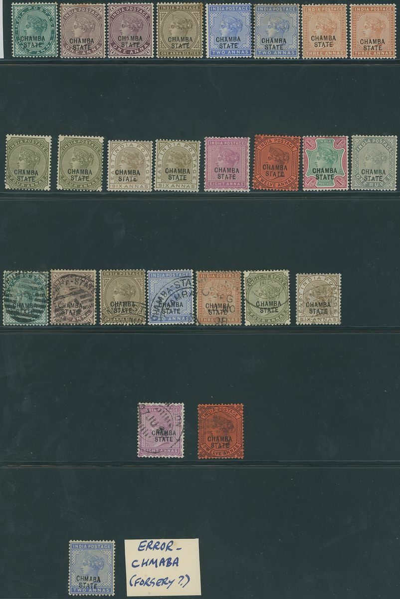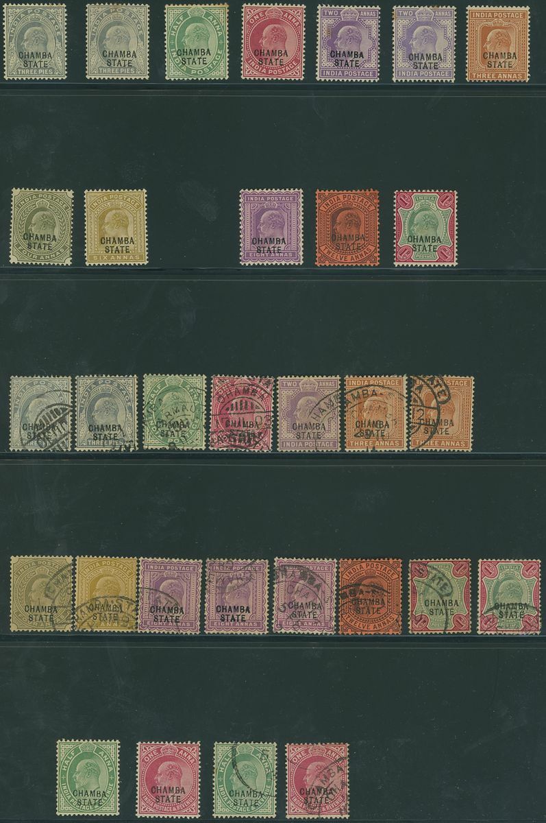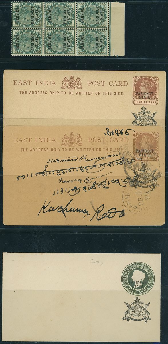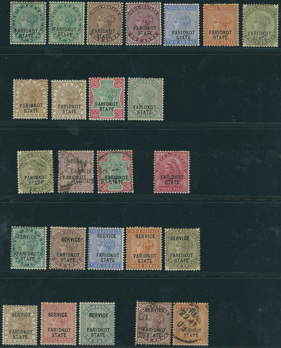 A mint and used collection; the mint include 1887-95 to 1r. (both) with some shades, 1900-04 3p. with overprint inverted (2), 1903-05 3p. to 1r., 1927-37 to 1r., 1938 to 1r. and Official 1887-98 to 12a. and 1927-39 to 1r.; the used include 1887-95 to 12a., 1900-04 2a. and 1903-05 3p. to 1r. (2). Also Faridkot mint and used collection including 1887-1900 to 1r. (both) mint and 1r. green and carmine used and Official 1887-98 1r. slate mint. A few faults though generally fine