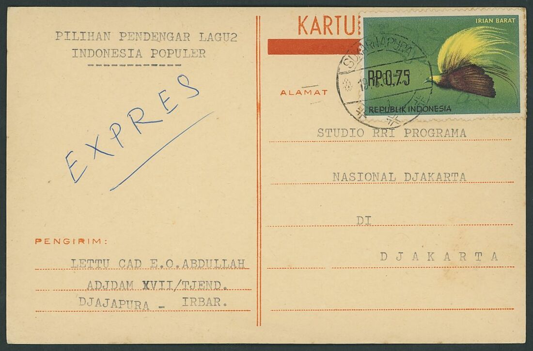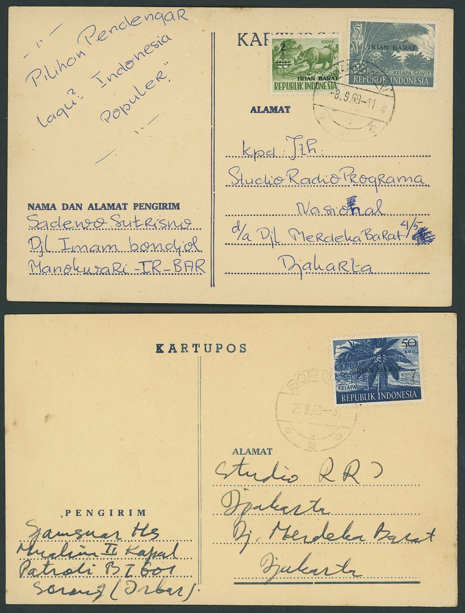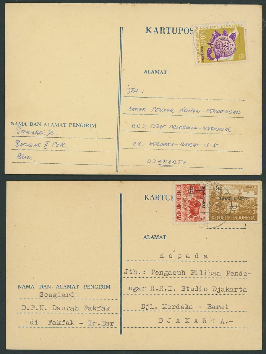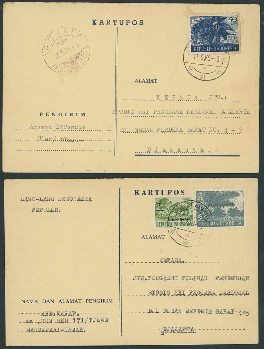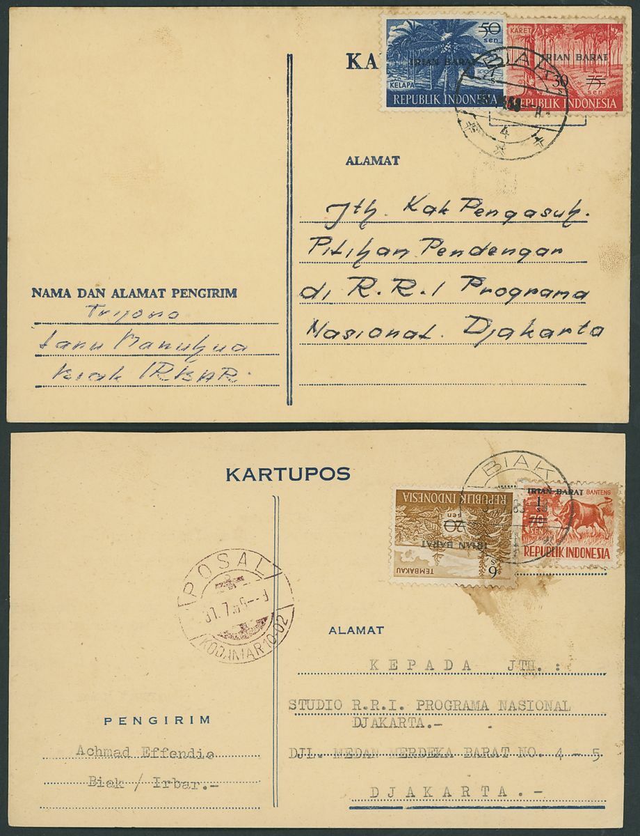 1969-71 a group of eleven postcards to Djakarta, mostly bearing 1963 surcharges or overprints, cancellations with Biak, Djajapuram Fakfak, Manokwari and Sorong, chiefly fine and a most unusual group