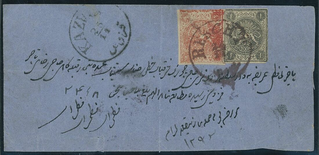 1876 (24 Nov.) envelope from Rescht to Qazvin bearing 1sh. grey black type 'D' and 4sh. vermilion type 'C' cancelled by neat despatch c.d.s. and showing alongside arrival (25.11) c.d.s., few usual minor imperfections including a vertical fold not affecting the adhesives, nevertheless a very rare cover. R.P.S. certificate 1997. S.G. 15, 17
