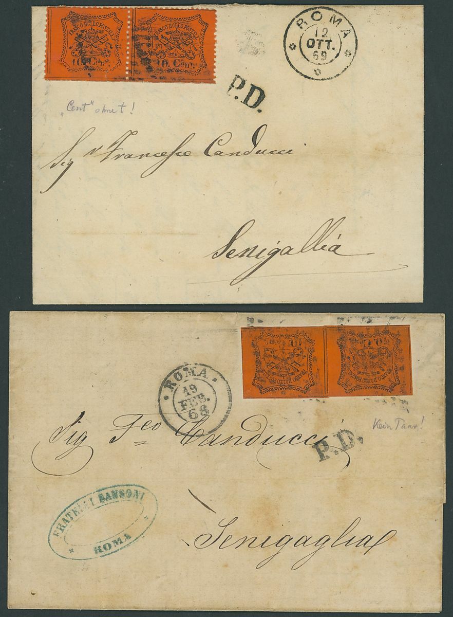 1868 and 1869. entire letters, ex the same correspondence, from Rome to Senigallia, franked imperf. or perf 10c. on vermilion, pair, one in each showing "t" in "Cent" omitted or practically omitted, some minor staining. S.G. 34, 46