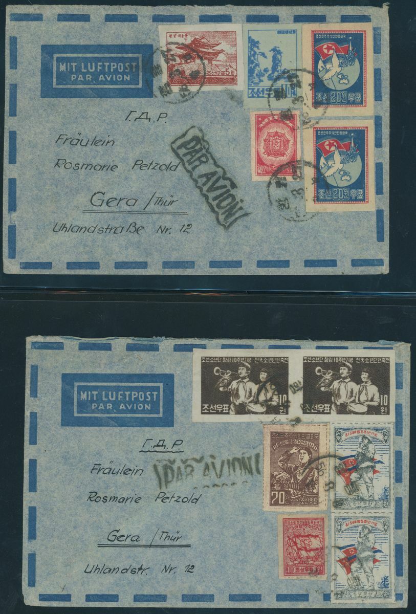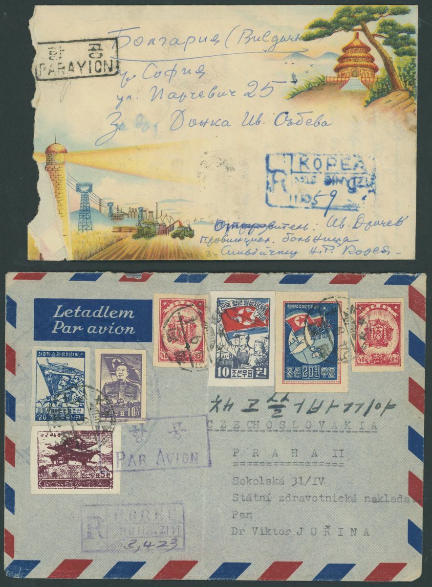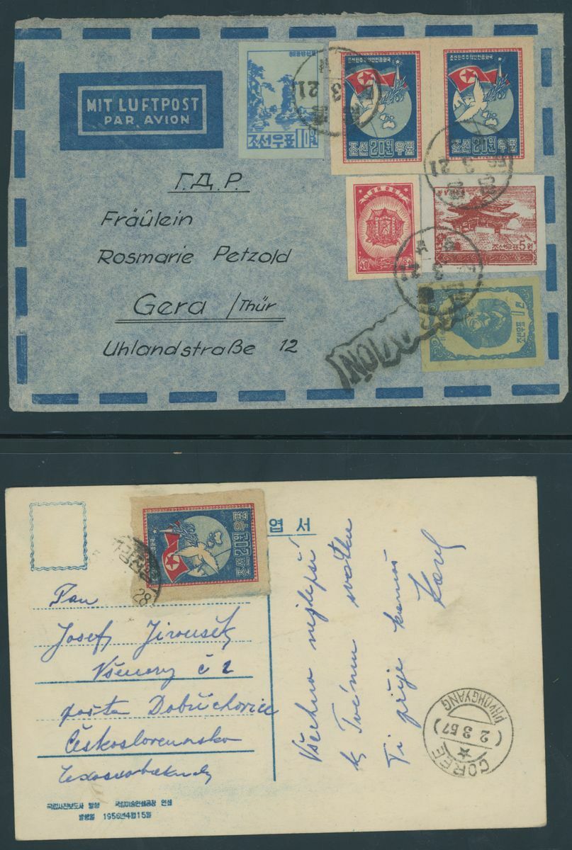 1955-57, thirteen covers and a card (seven registered) to Bulgaria, Czechoslovakia, Germany, Russia or Switzerland, from Chondzin, Gaisung, Phyongyang, Sinyizu, etc., a good variety of frankings. chiefly fine. A valuable and interesting group
