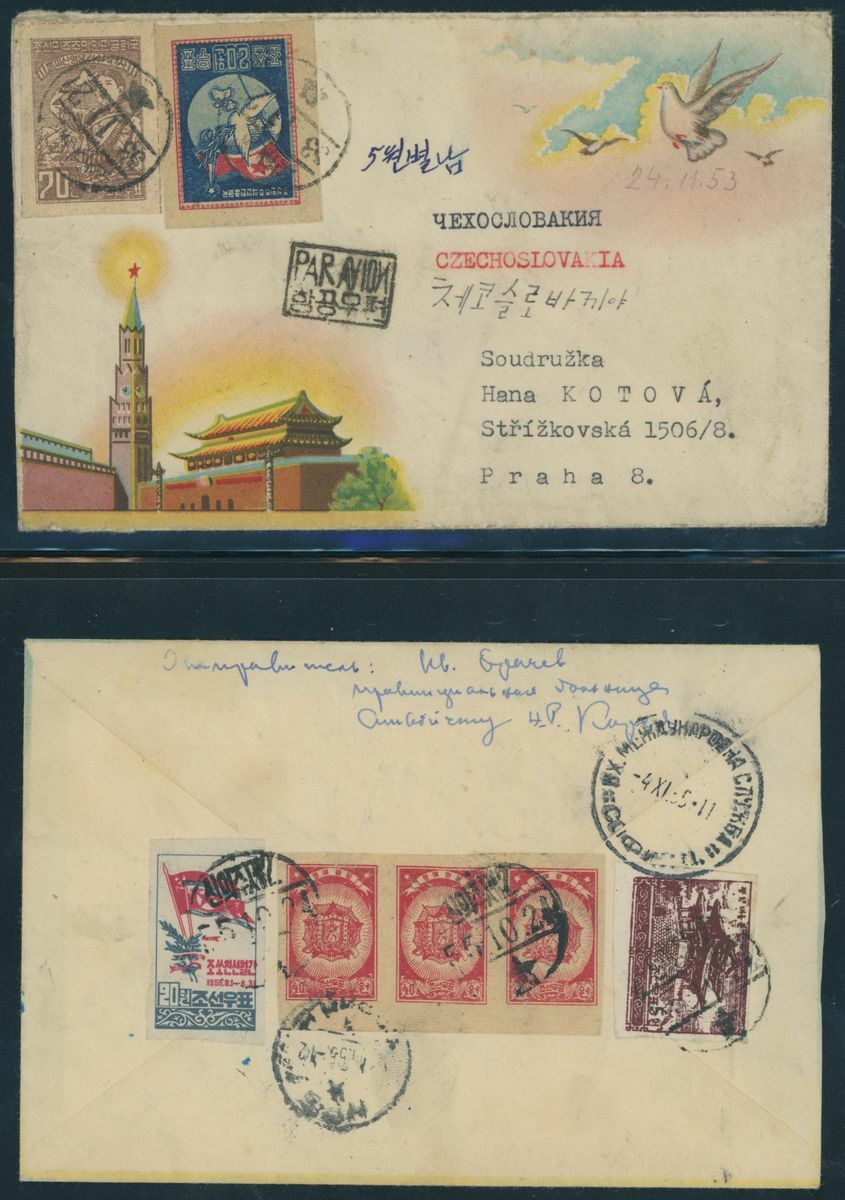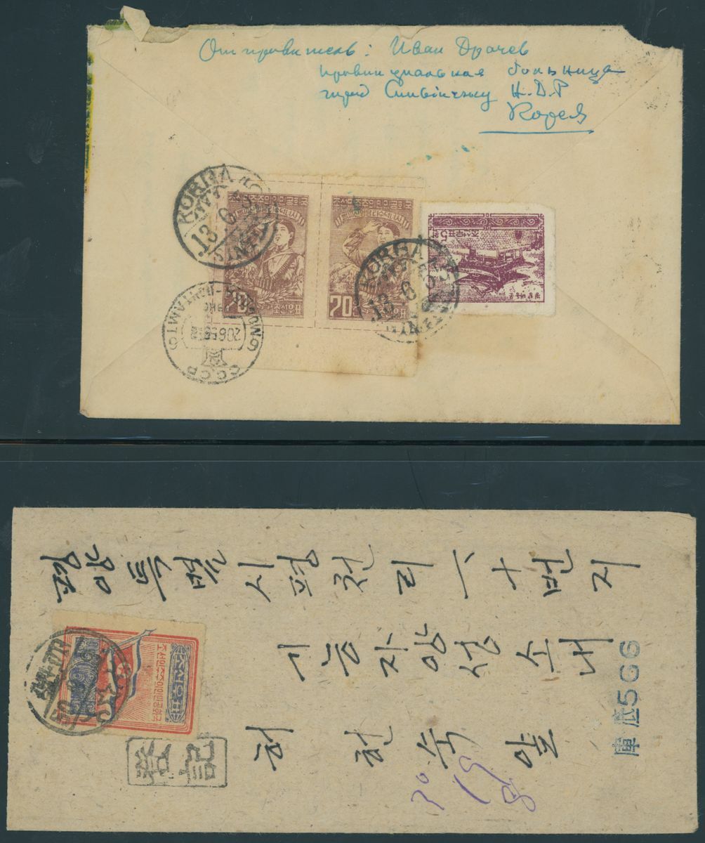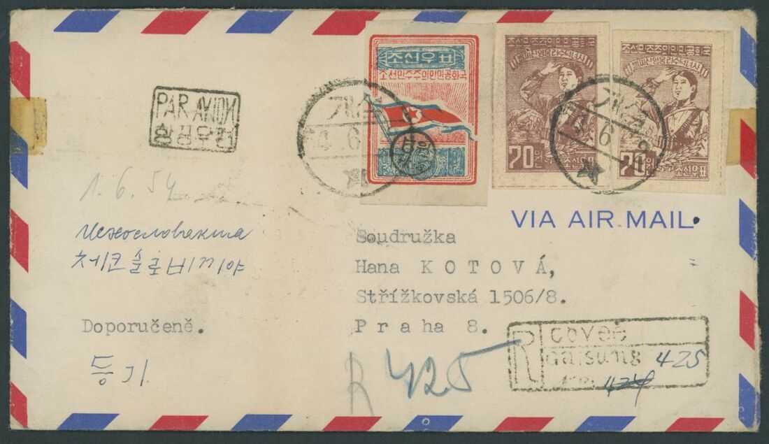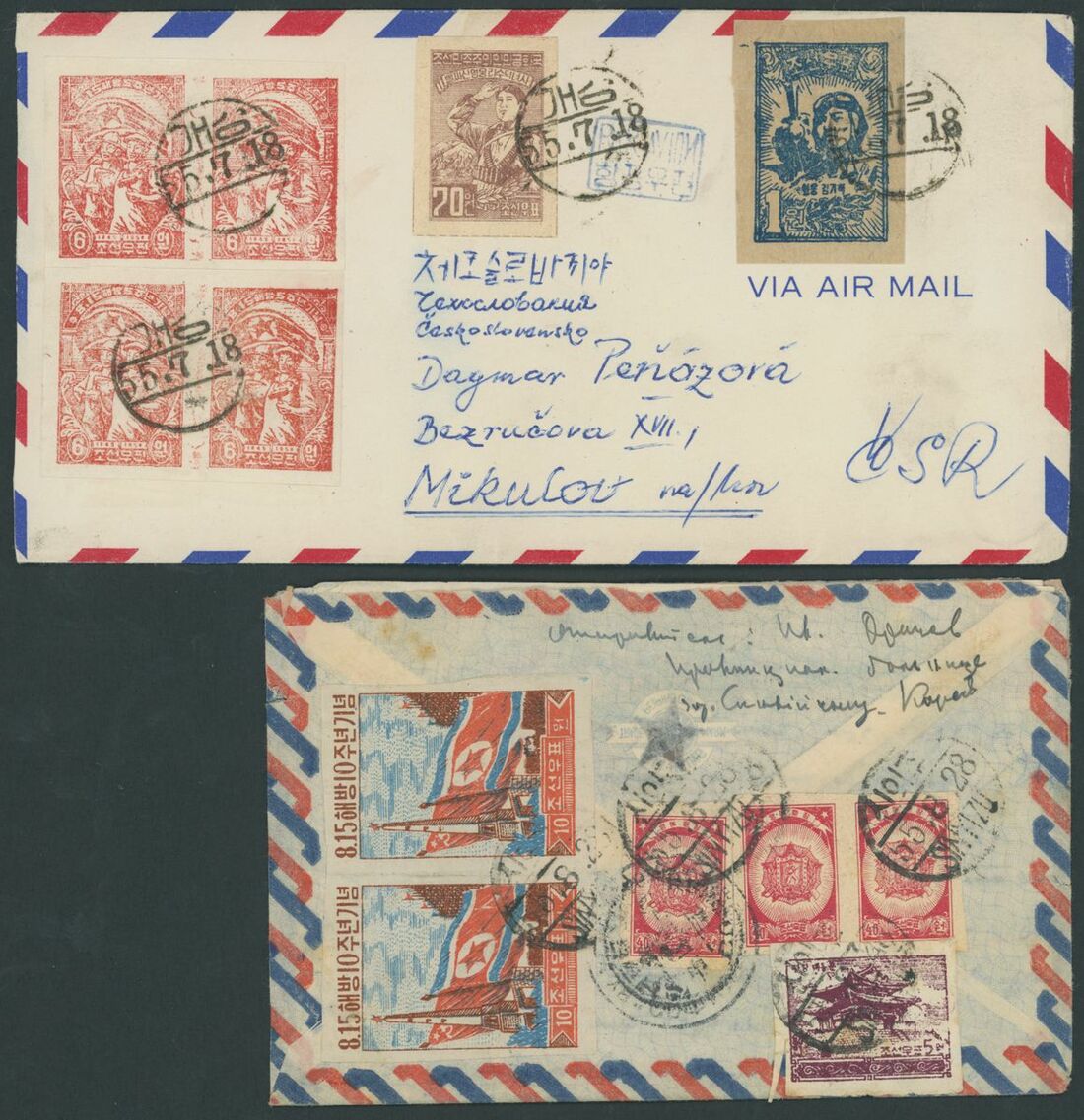 1955-57, thirteen covers and a card (seven registered) to Bulgaria, Czechoslovakia, Germany, Russia or Switzerland, from Chondzin, Gaisung, Phyongyang, Sinyizu, etc., a good variety of frankings. chiefly fine. A valuable and interesting group