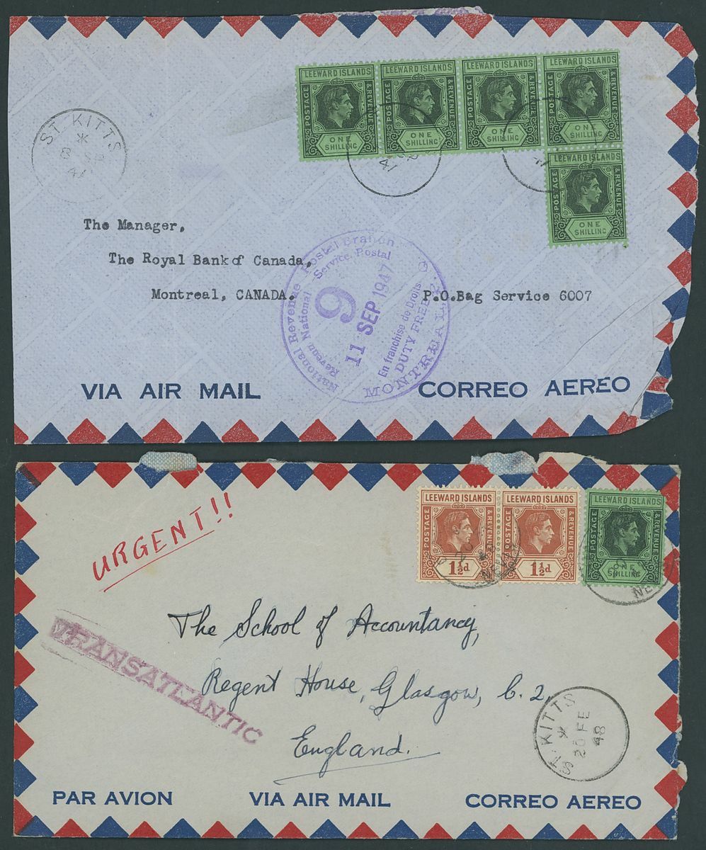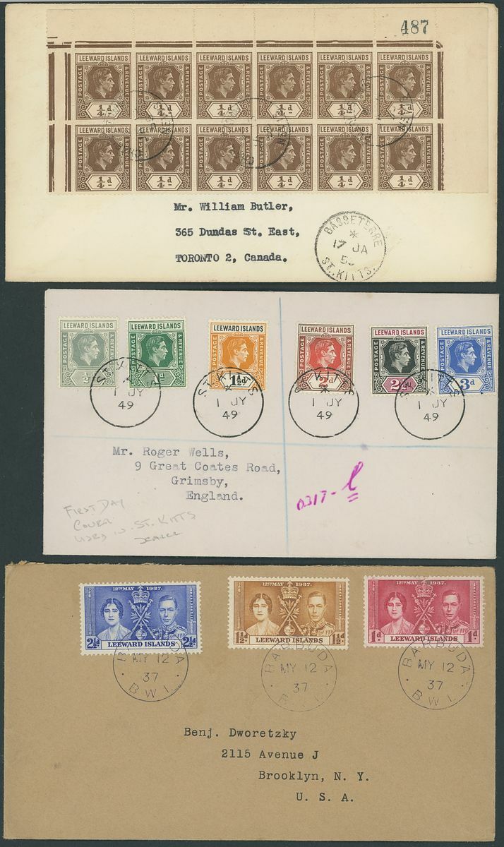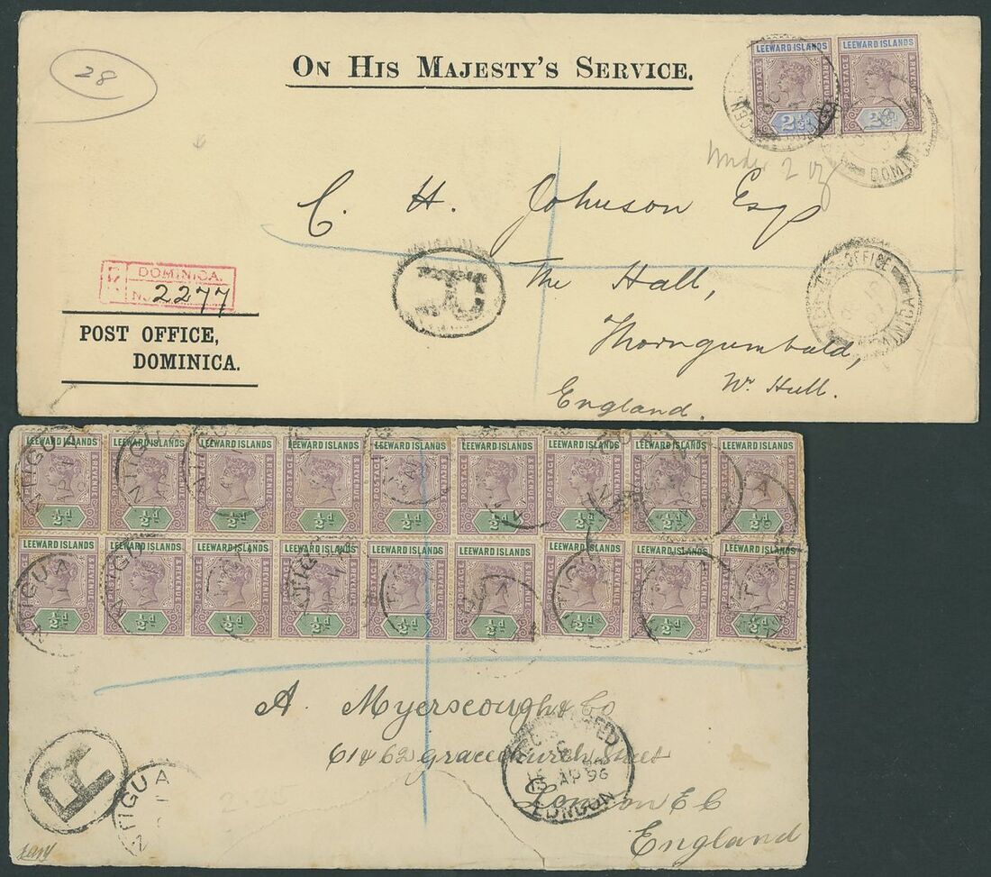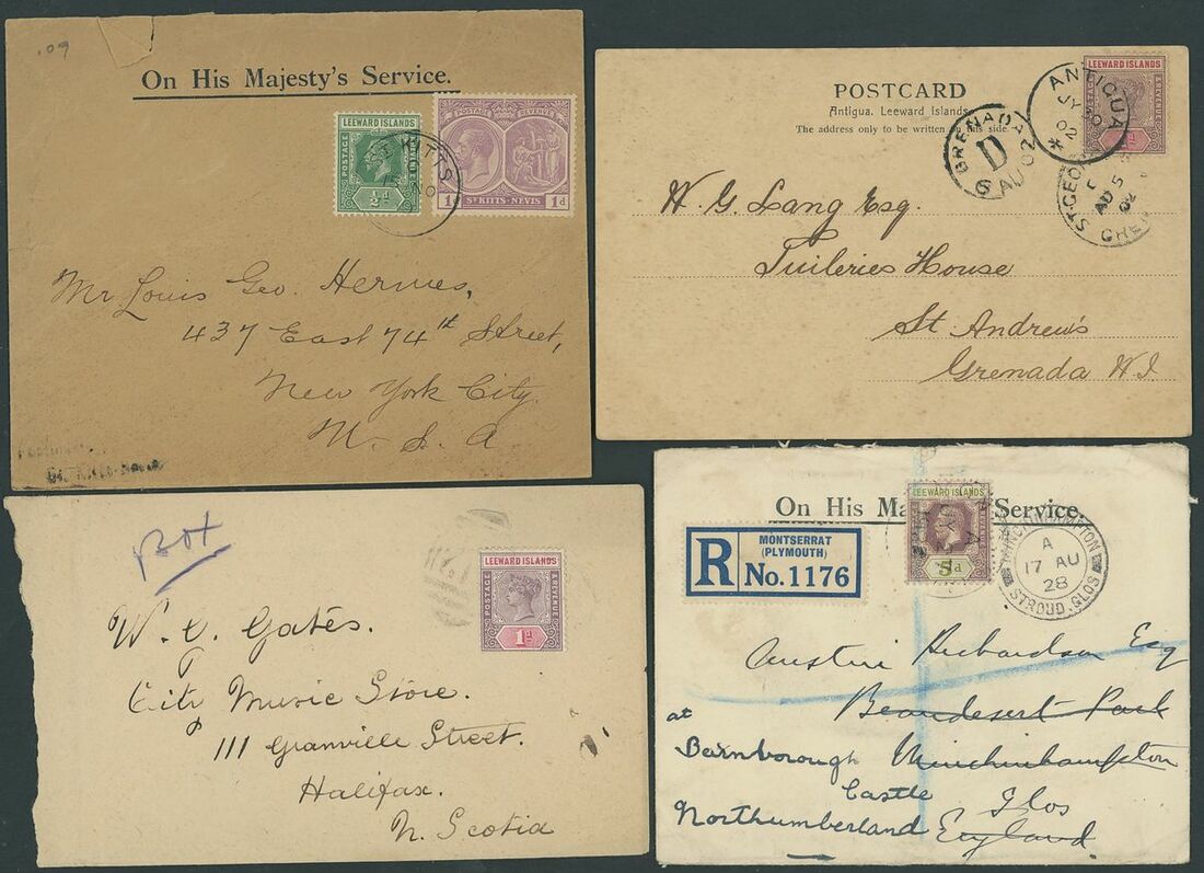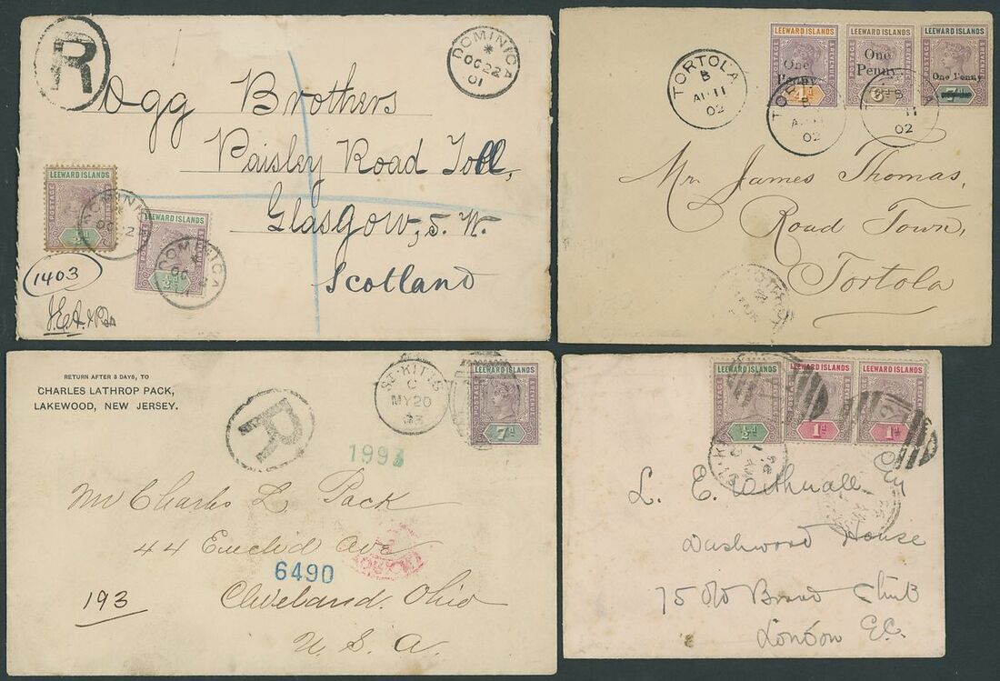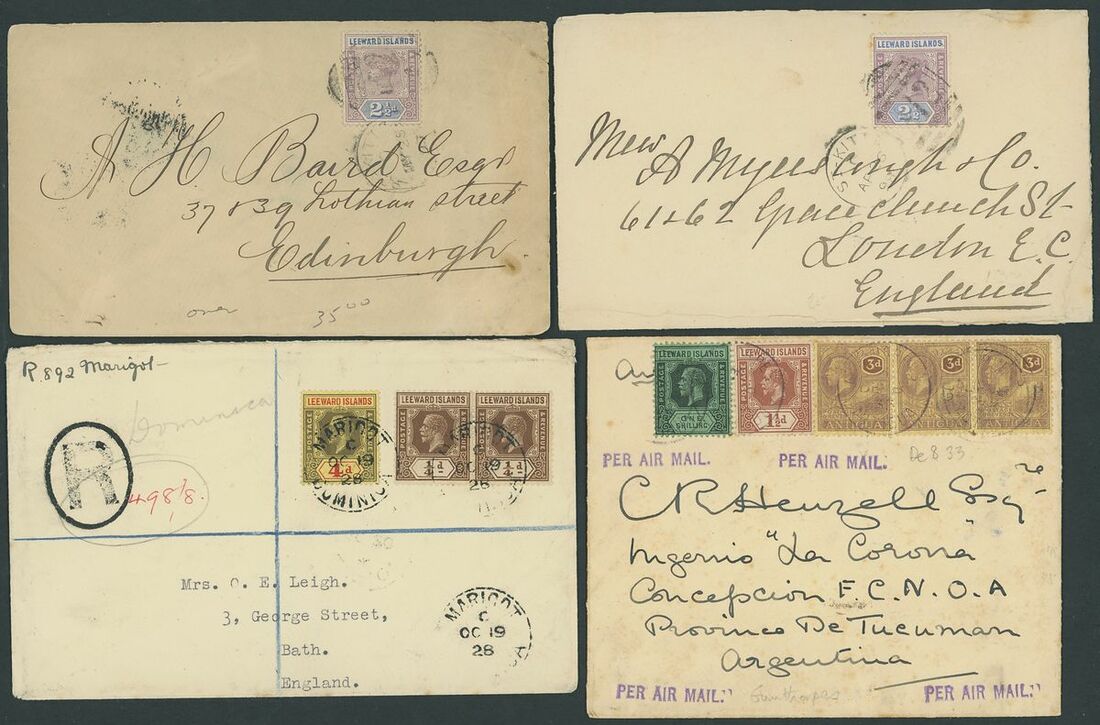 1895 to 1948, selection of thirty-four covers or cards, including 1890 1d. (18) on long envelope registered from Antigua to London, 1d. tied by "A11" barred oval on cover from S. Vincent to London, 2½d. (2) on long O.H.M.S envelope registered from Dominica to Hull, 1902 surcharge set on piece with St. Kitts cancellation, another on Tortola local cover, 1907-11 6d. on long O.H.M.S. cover Registered from Dominica to London, 1921-32 1½d. red-brown and 1/- with Antigua 3d. (3) on 1933 (Dec.) Air Mail cover to Argentina, ¼d. (2) Dominica 1d. on 1934 cover from Dominica to Canada, Censored, etc., chiefly good to fine