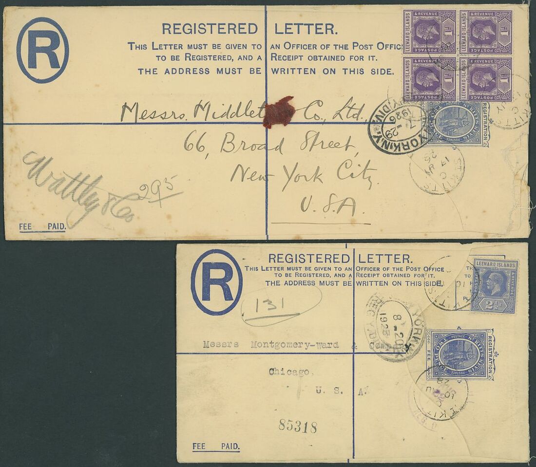 1921-32 1d. bright violet, tied to St. Kitts 2d. Registered postal stationery envelope (size H2), also 2½d. bight blue, tied to St. Kitts 2d. Registered postal stationery envelope (size G), both to New York, and with arrival datestamps; the second with staple holes, good to fine