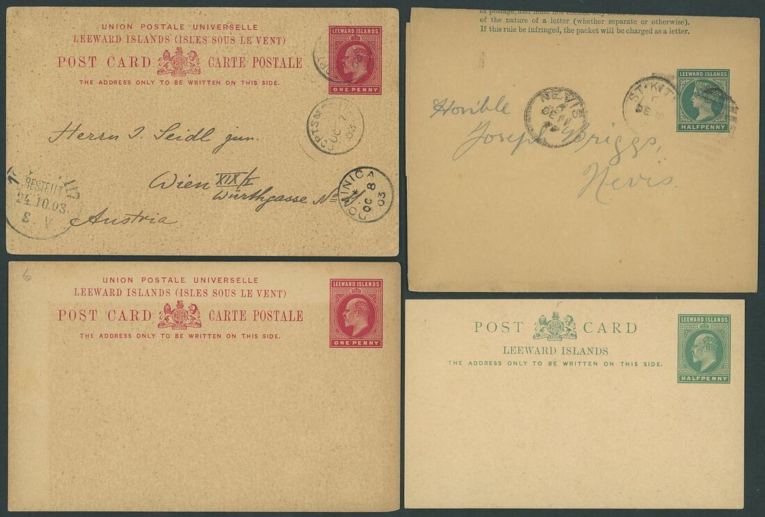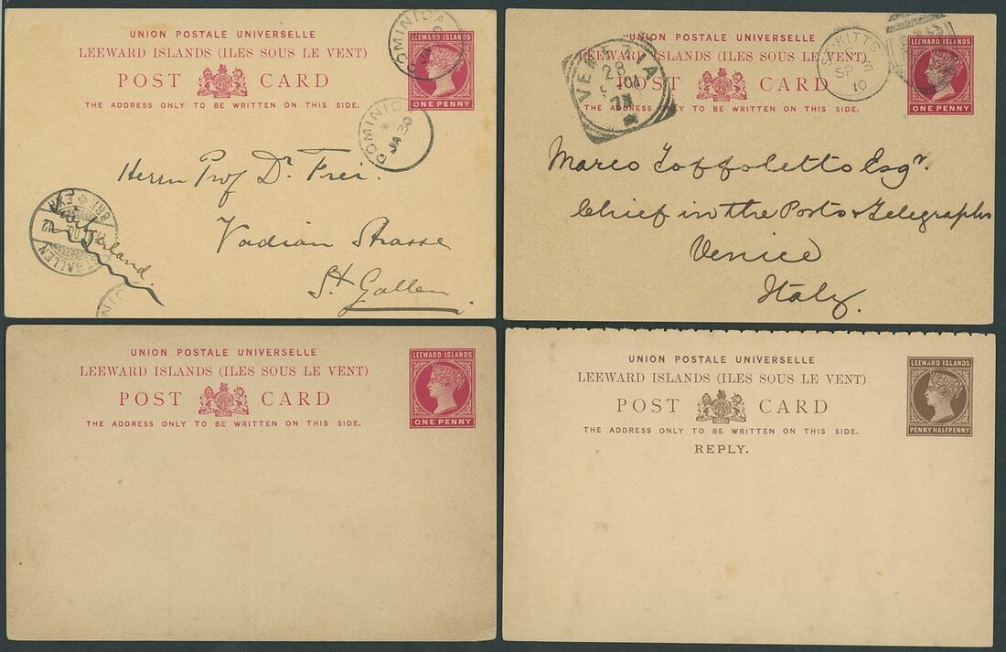 Mint and used selection (24 items), including post cards with 1900 1d. to St. Gallen with Dominica cancellation, 1901 1d. to Venice with St. Kitts duplex cancellation, reply paid cards, envelopes with 1892 1d. additionally franked 1d. (3) with Antigua cancellations, 1895 1d. additionally franked 6d. with St. Kitts "A12" cancellation, 1895 1d. envelope additionally franked 1d. and 2½d. with St. Kitts "A12" cancellations, 1895 2d. envelope with St. Kitts "A12" cancellation, etc., chiefly good to fine