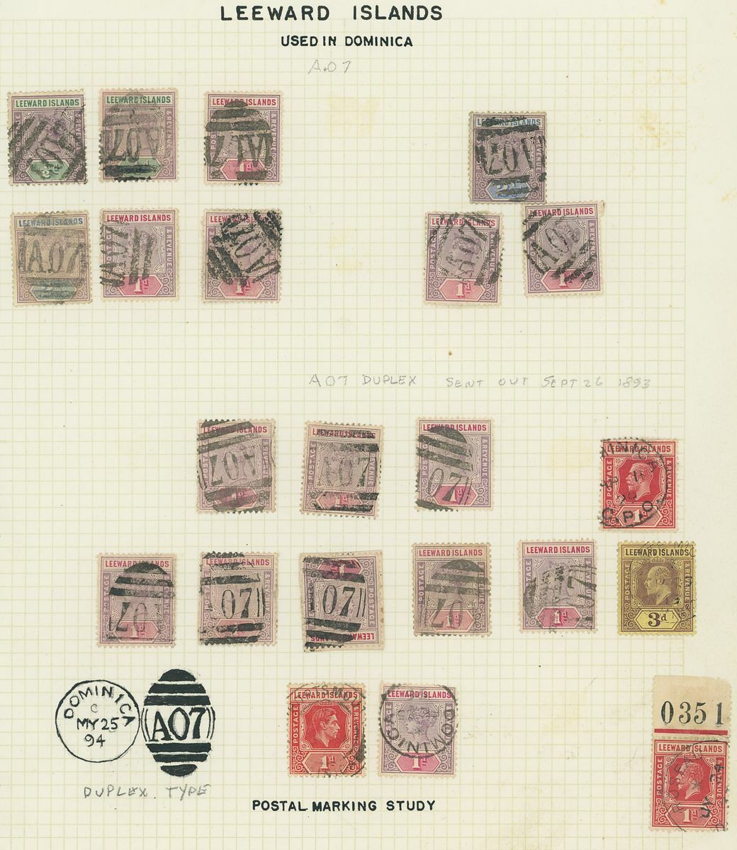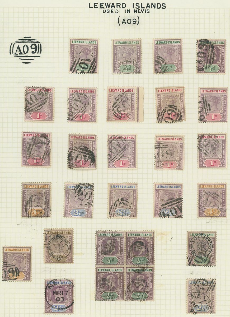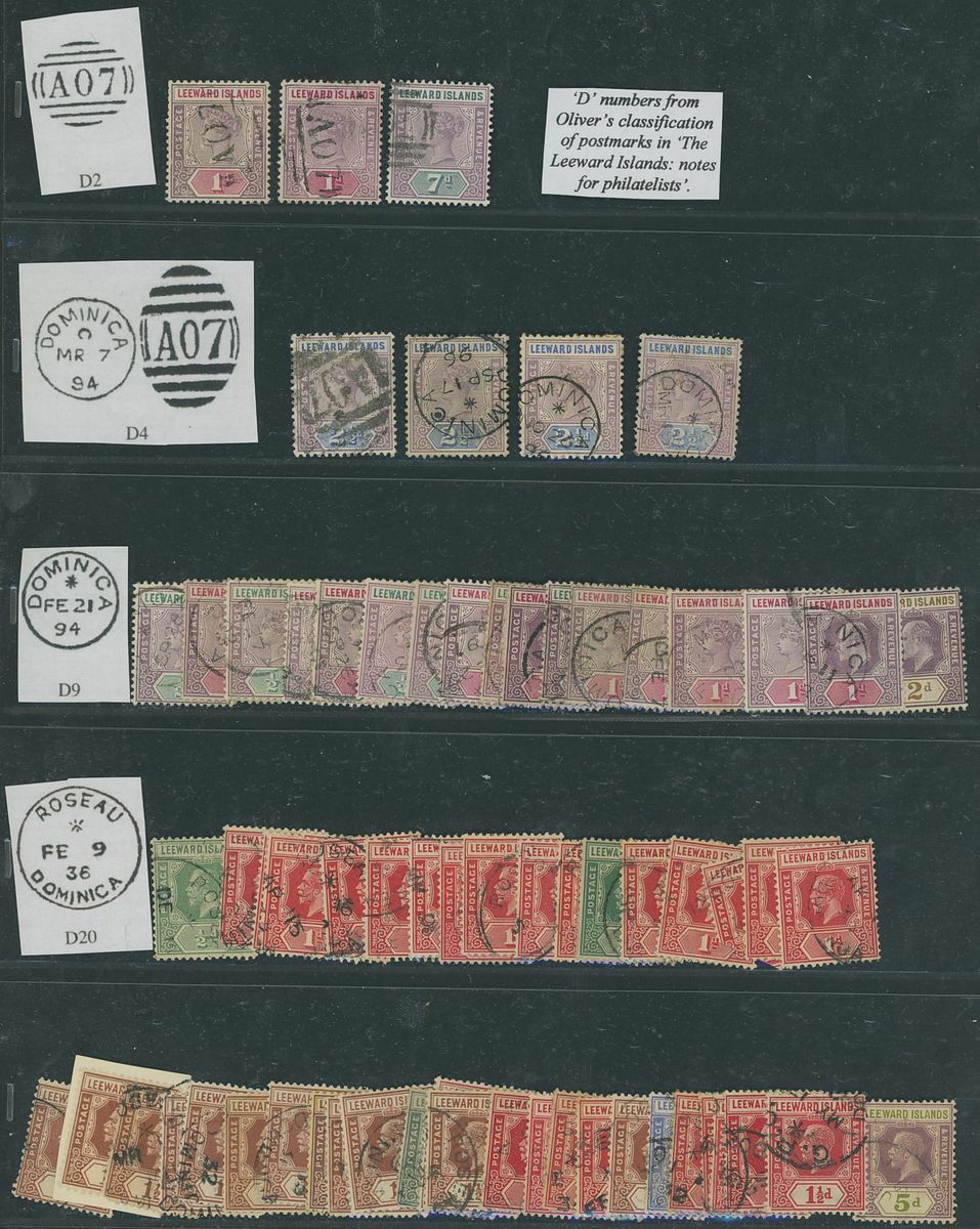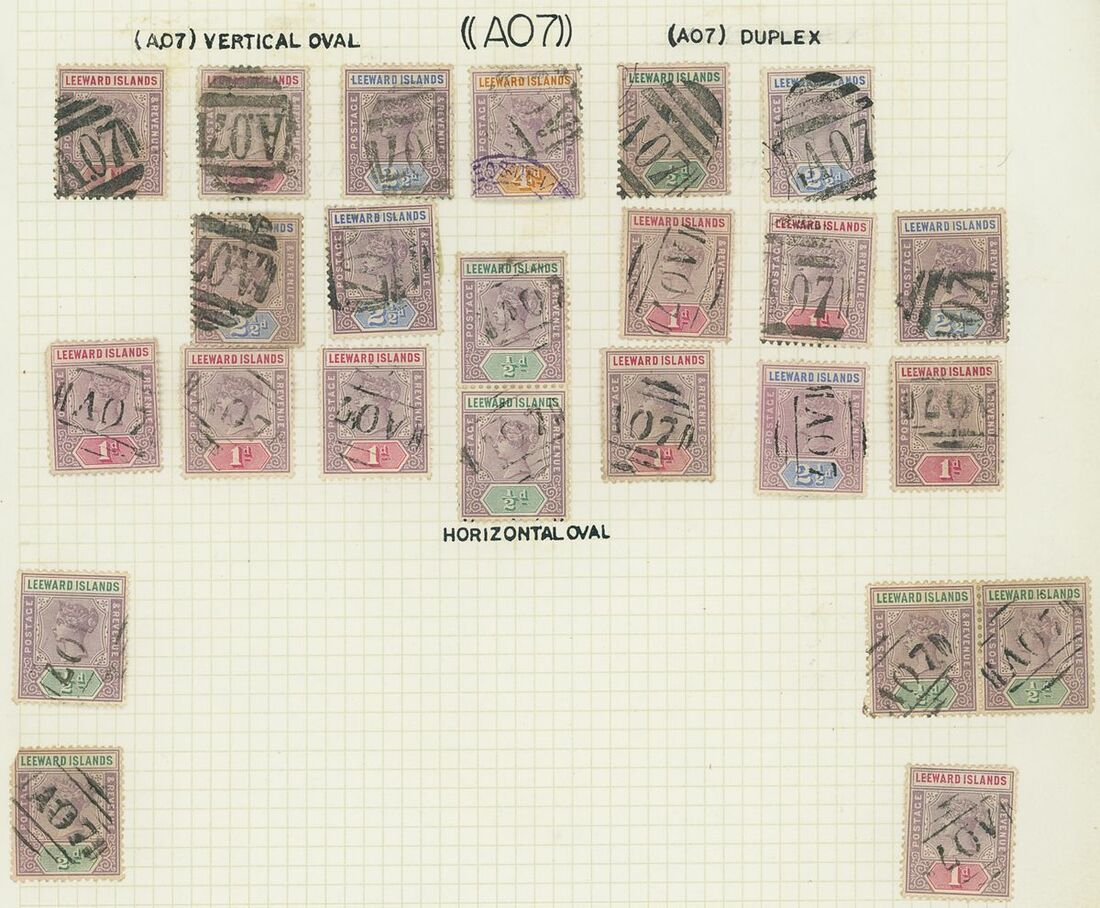Collection on pages, including Antigua, Dominica (120+) with horizontal and vertical oval "A07", Montserrat, Nevis, St. Kitts (150+), etc., mixed condition