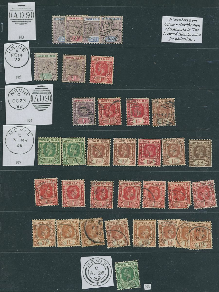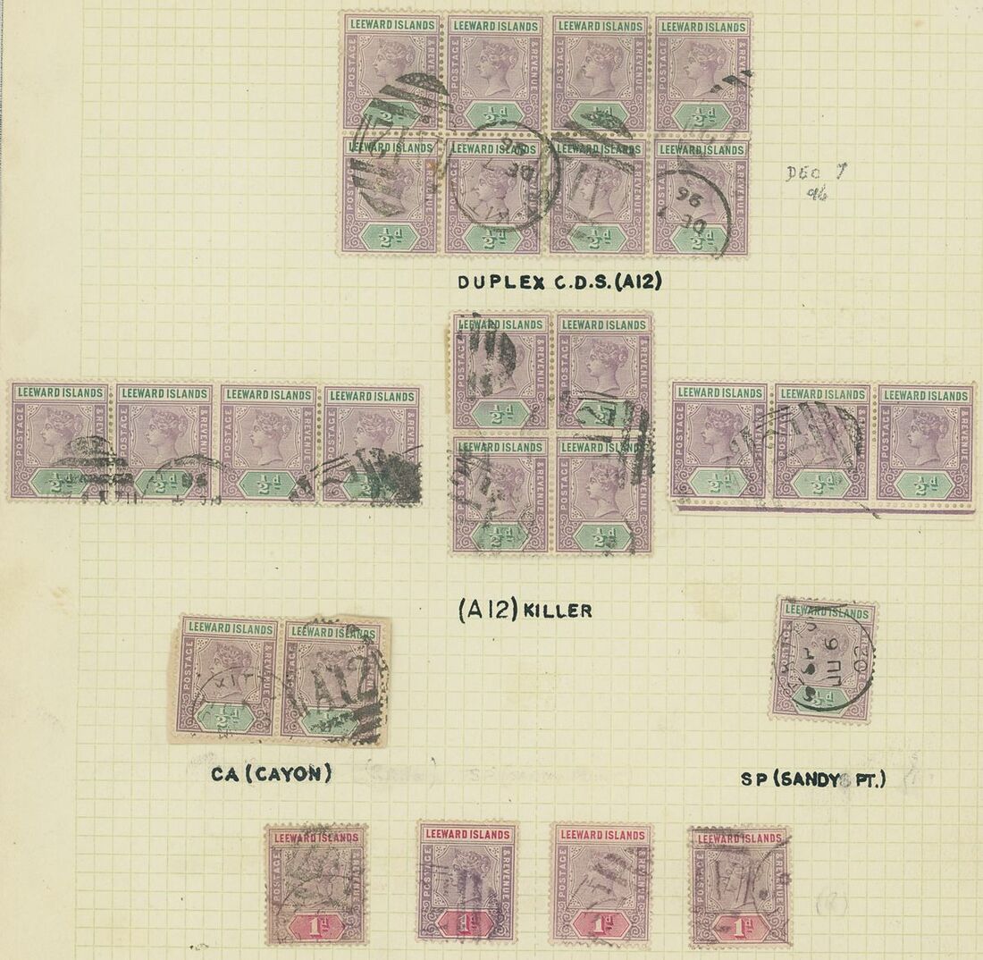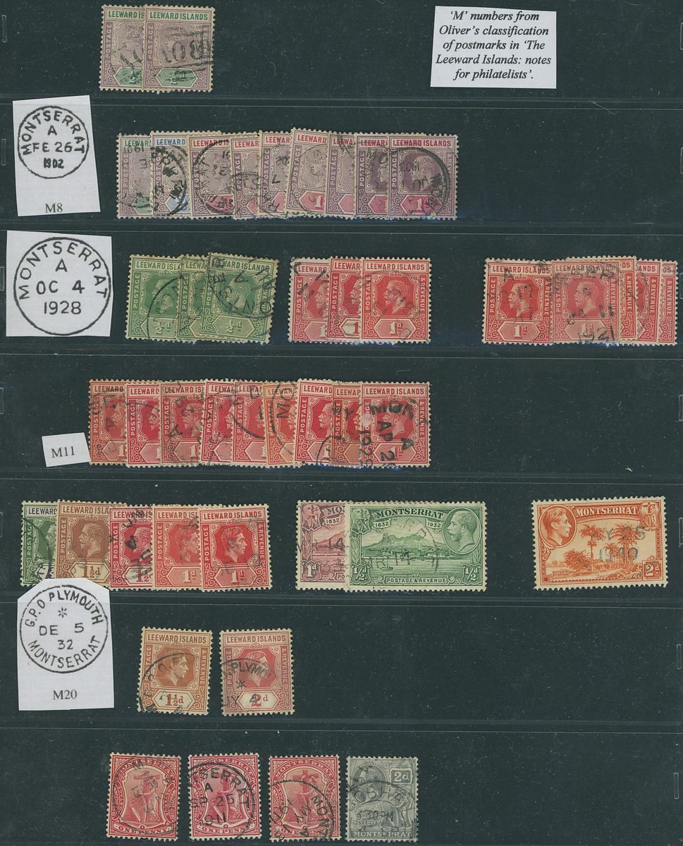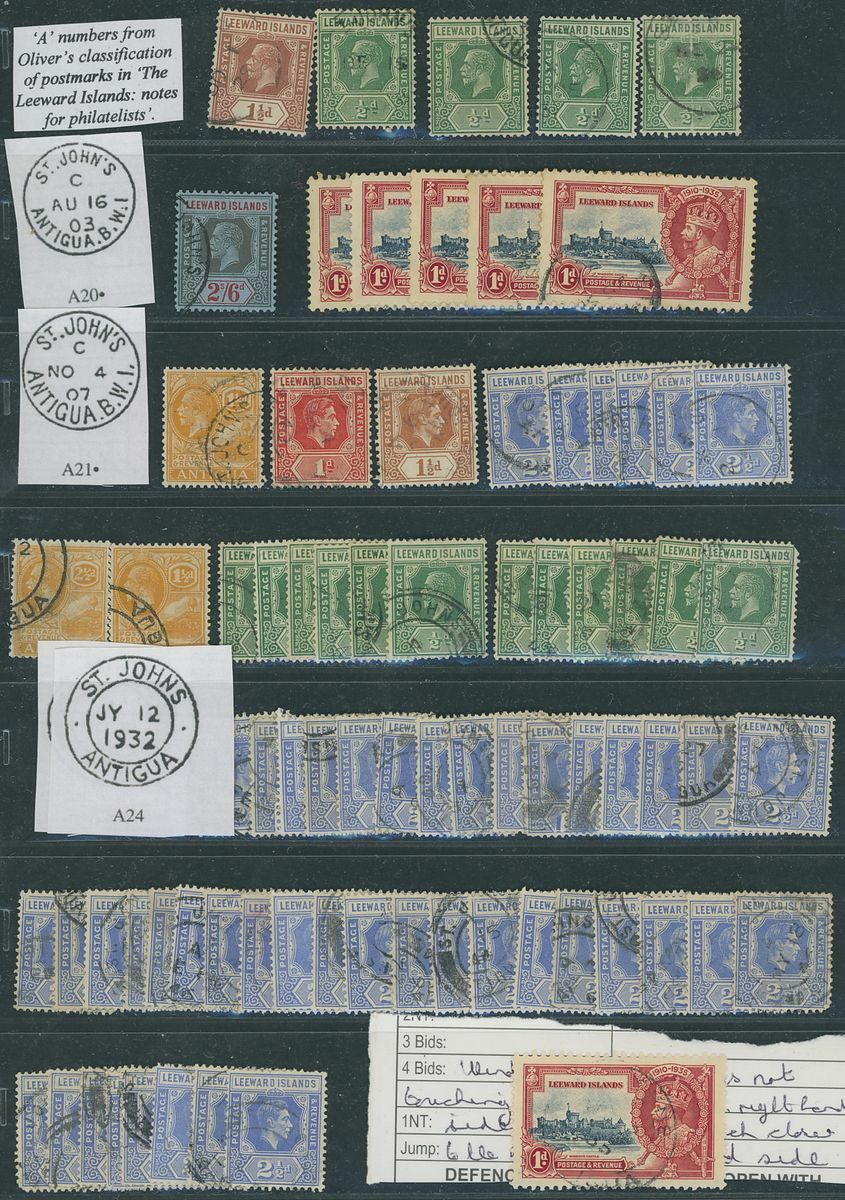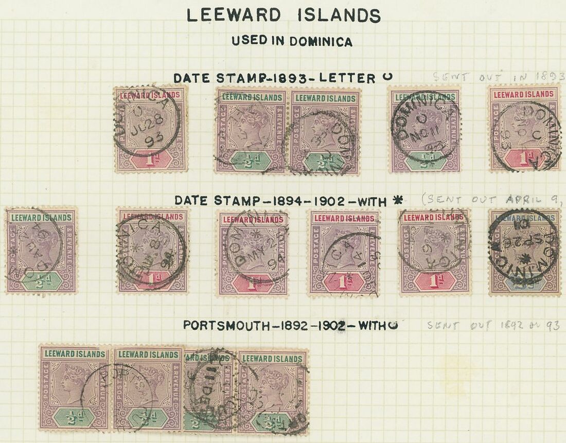 Collection on pages, including Antigua, Dominica (120+) with horizontal and vertical oval "A07", Montserrat, Nevis, St. Kitts (150+), etc., mixed condition