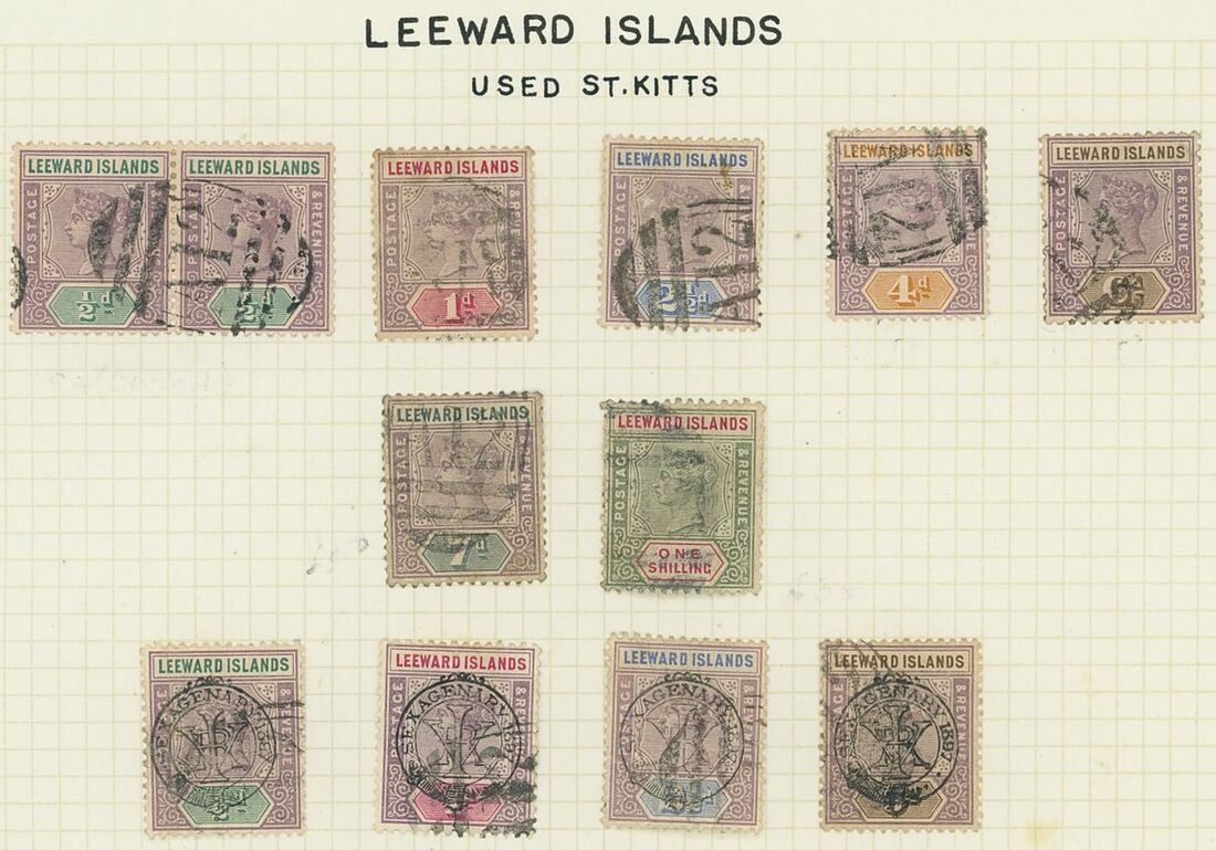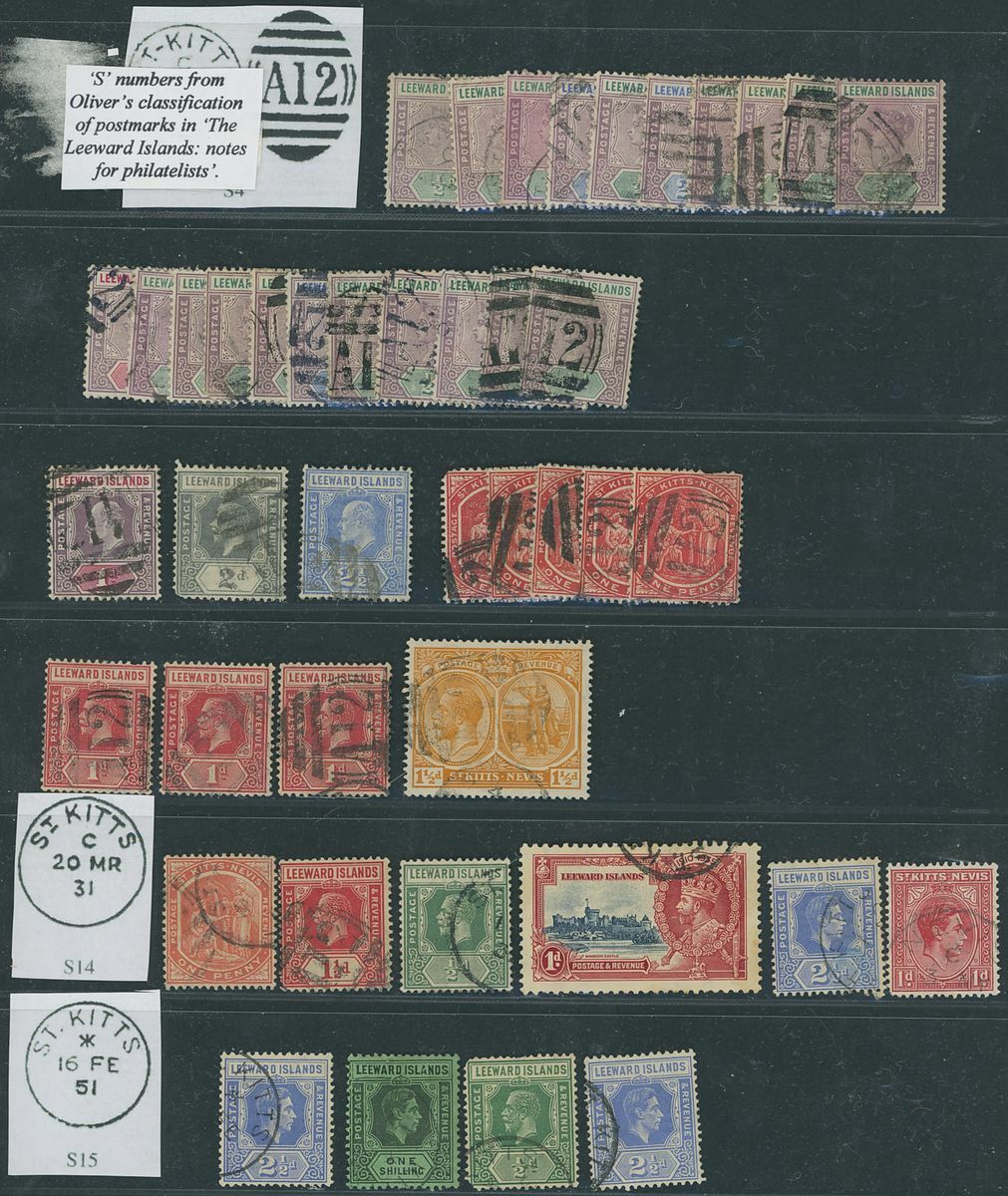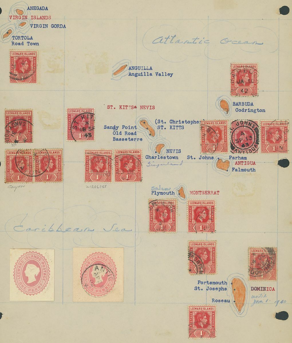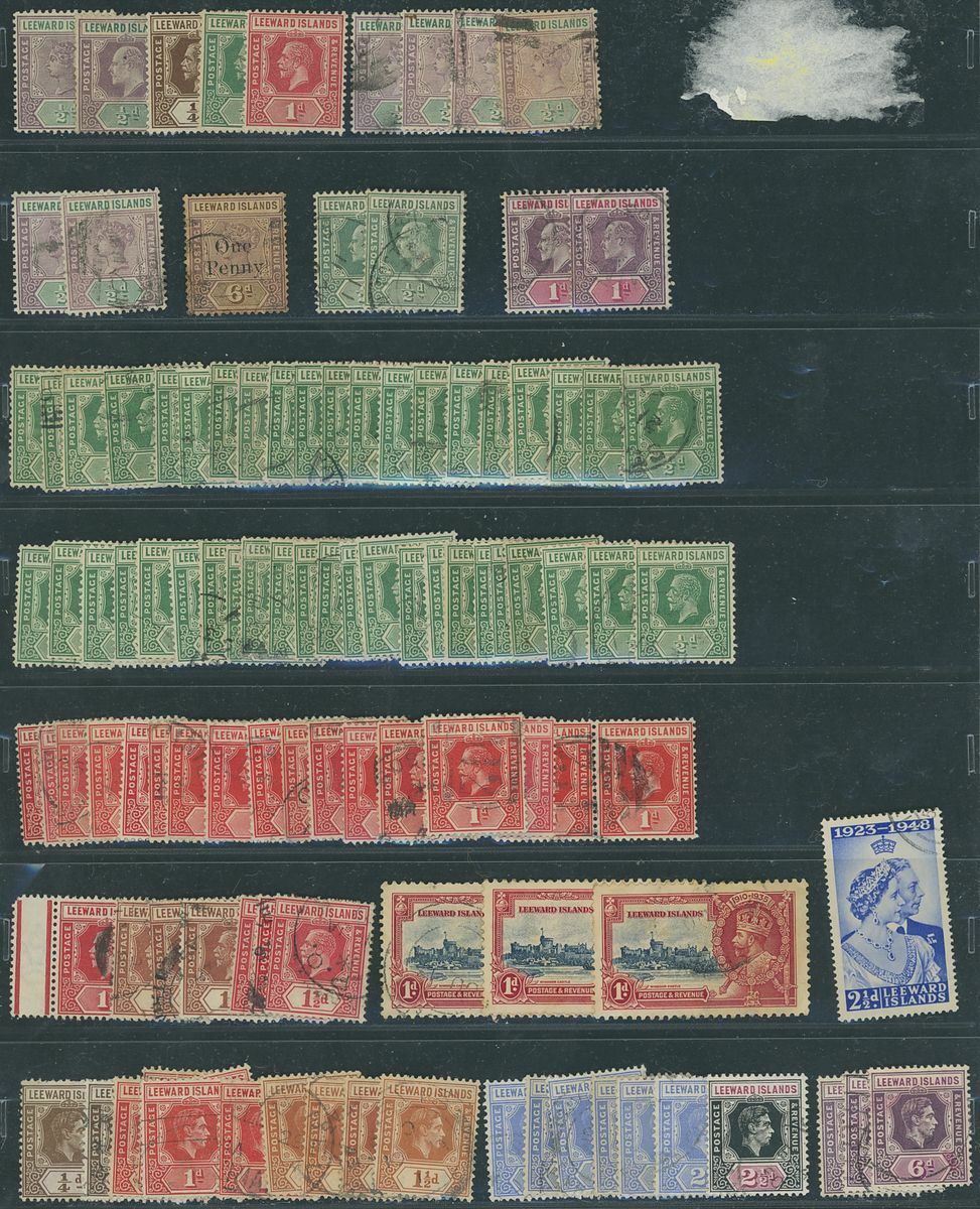Collection on pages, including Antigua, Dominica (120+) with horizontal and vertical oval "A07", Montserrat, Nevis, St. Kitts (150+), etc., mixed condition