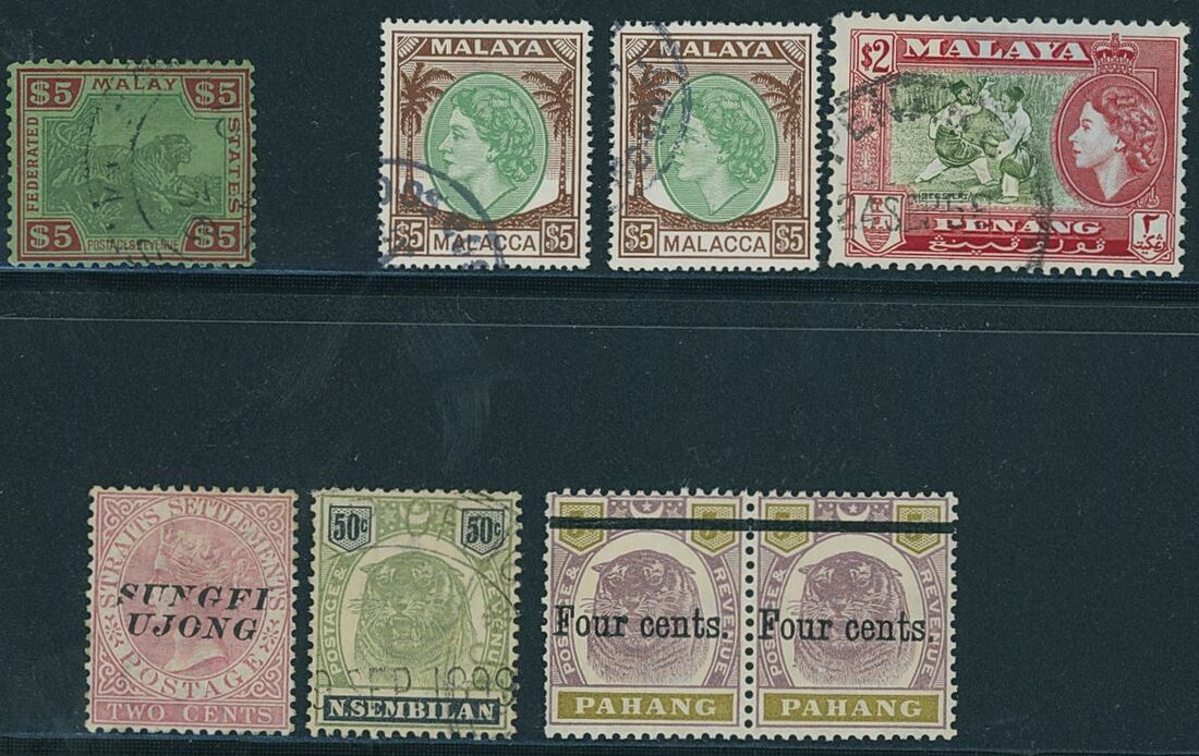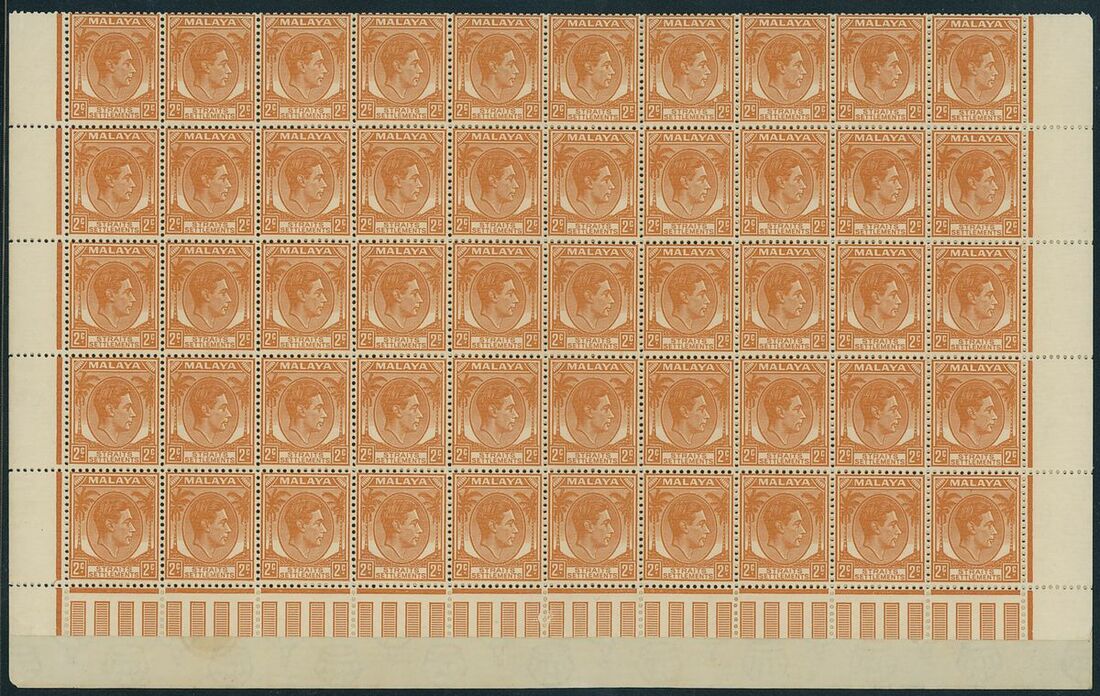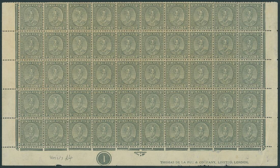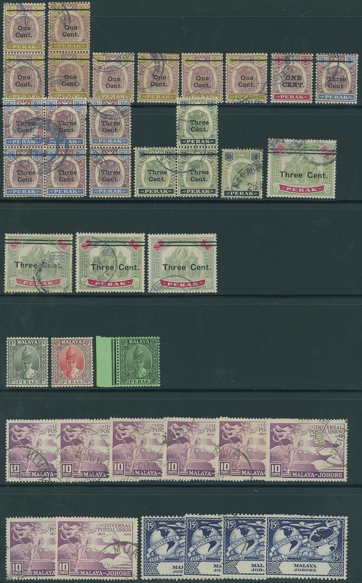 A small collection comprising Straits Settlements 1912-23 $25 fiscally used, 1937-41 2c. complete sheet and plate block of fifty, Federated Malay States 1922-34 $5 used, Malaya Postal Union Postage Due values including 1936-38 4c. green, 8c. scarlet pair, 10c. yellow-orange, 12c. corner marginal, 50c. and 1945-49 15c. mint, Johore Postage Due set, Pahang 1935-41 6c. plate block of fifty, Perak 1900 surcharges, various values in used blocks of four, States U.P.U. and omnibus values used. Mixed condition though a useful group. S.G. c.£3,000+