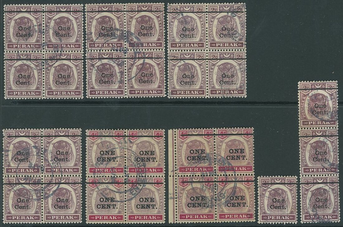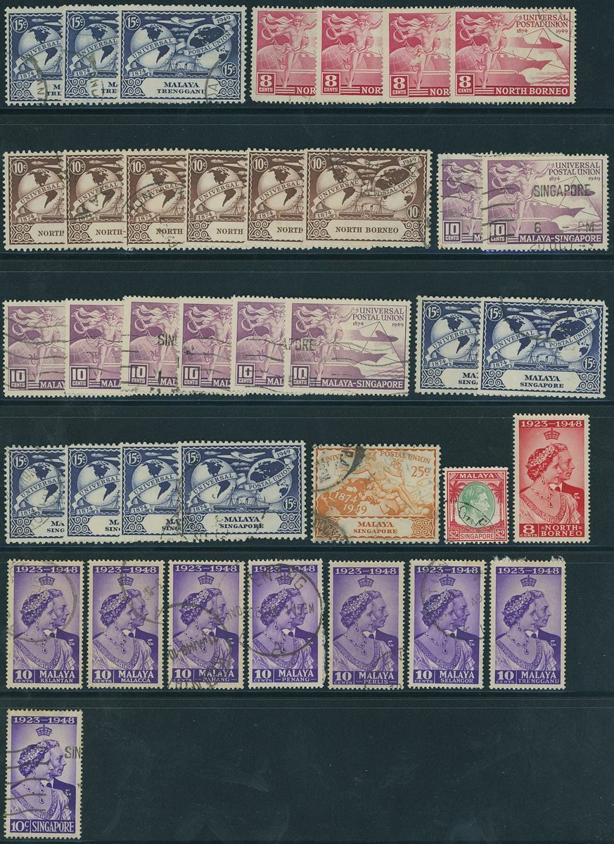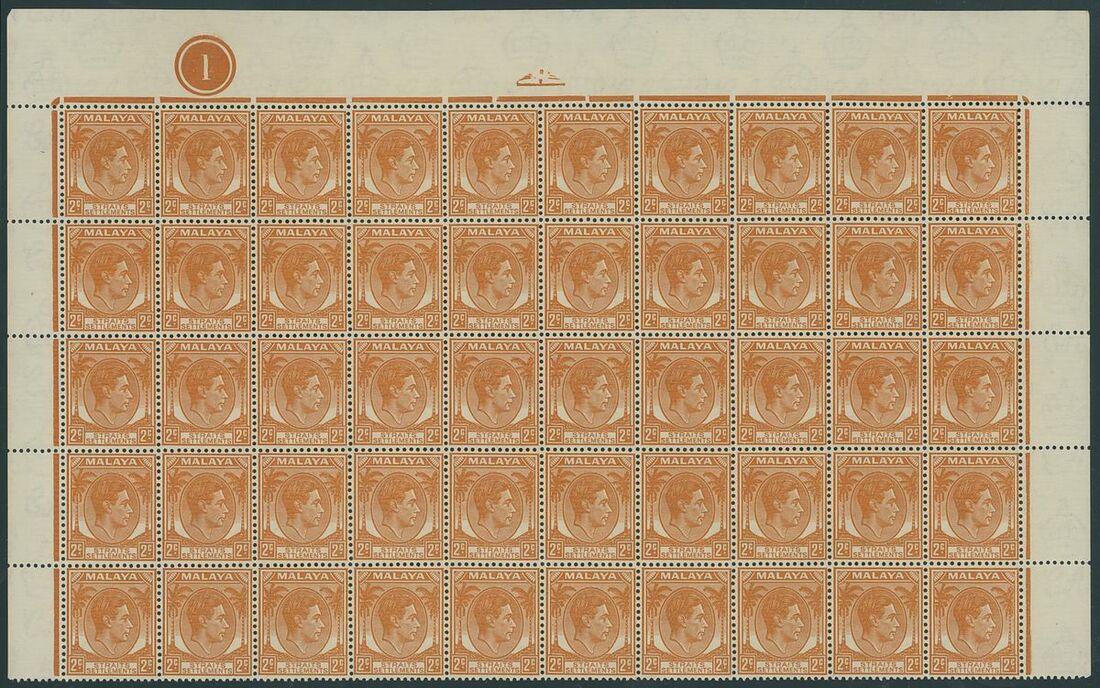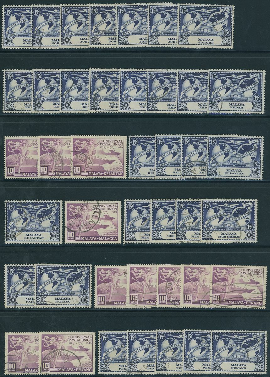 A small collection comprising Straits Settlements 1912-23 $25 fiscally used, 1937-41 2c. complete sheet and plate block of fifty, Federated Malay States 1922-34 $5 used, Malaya Postal Union Postage Due values including 1936-38 4c. green, 8c. scarlet pair, 10c. yellow-orange, 12c. corner marginal, 50c. and 1945-49 15c. mint, Johore Postage Due set, Pahang 1935-41 6c. plate block of fifty, Perak 1900 surcharges, various values in used blocks of four, States U.P.U. and omnibus values used. Mixed condition though a useful group. S.G. c.£3,000+