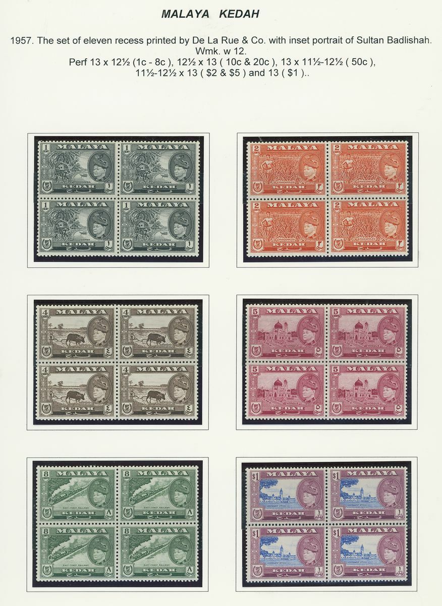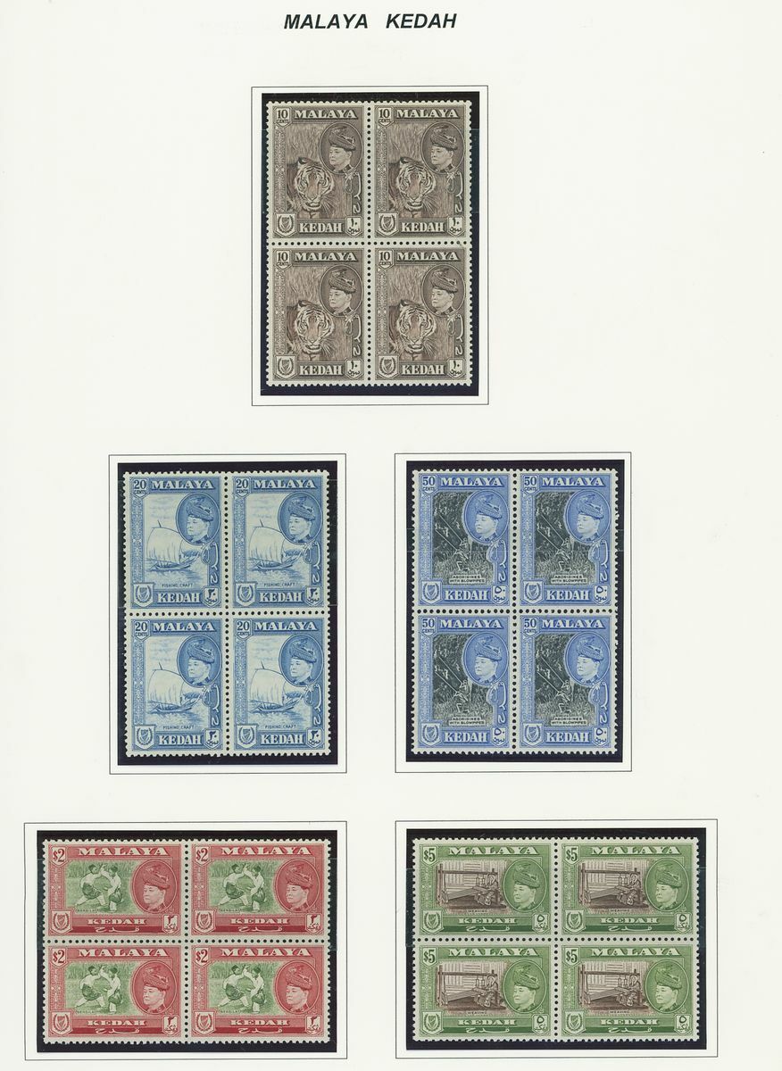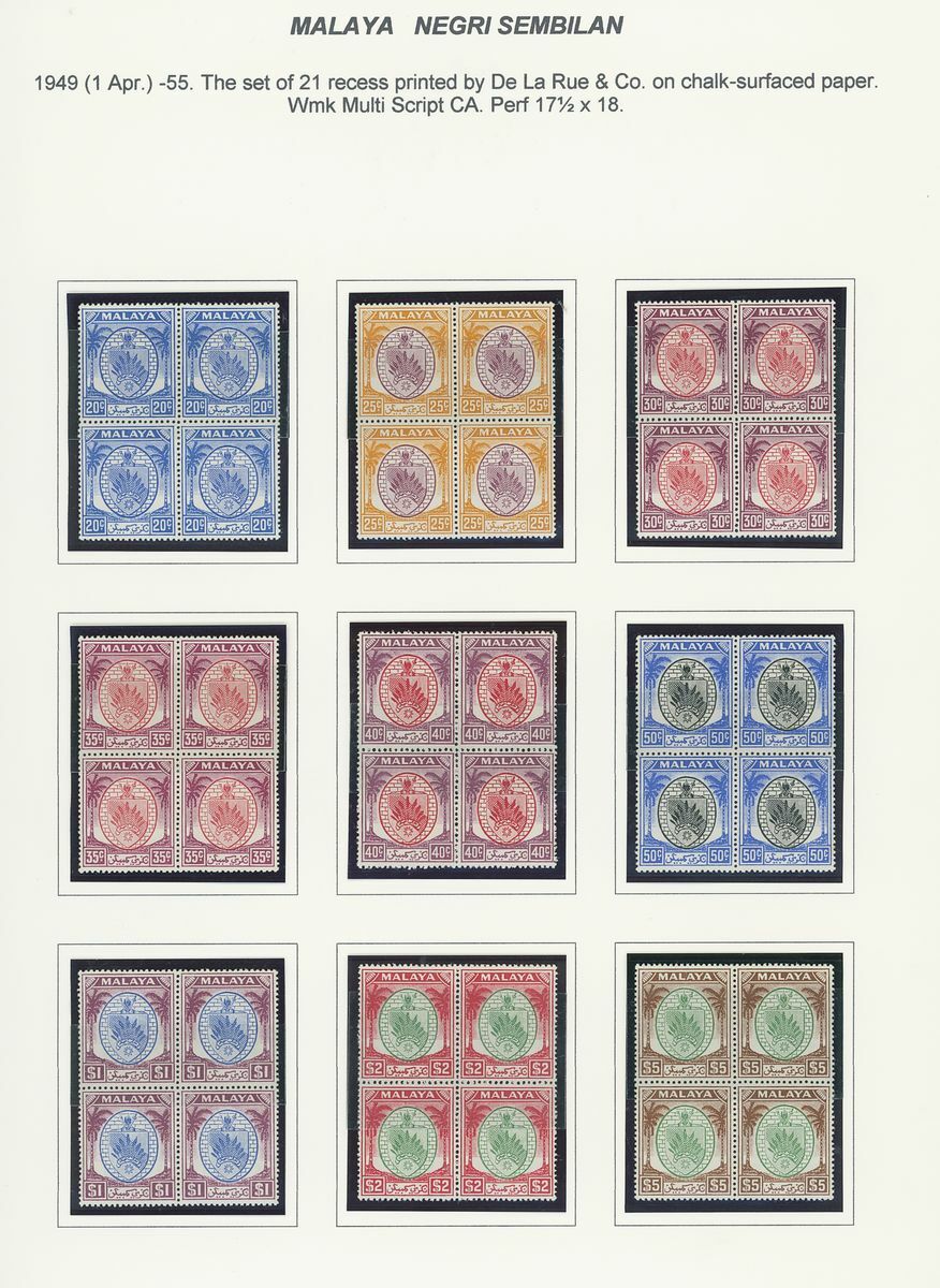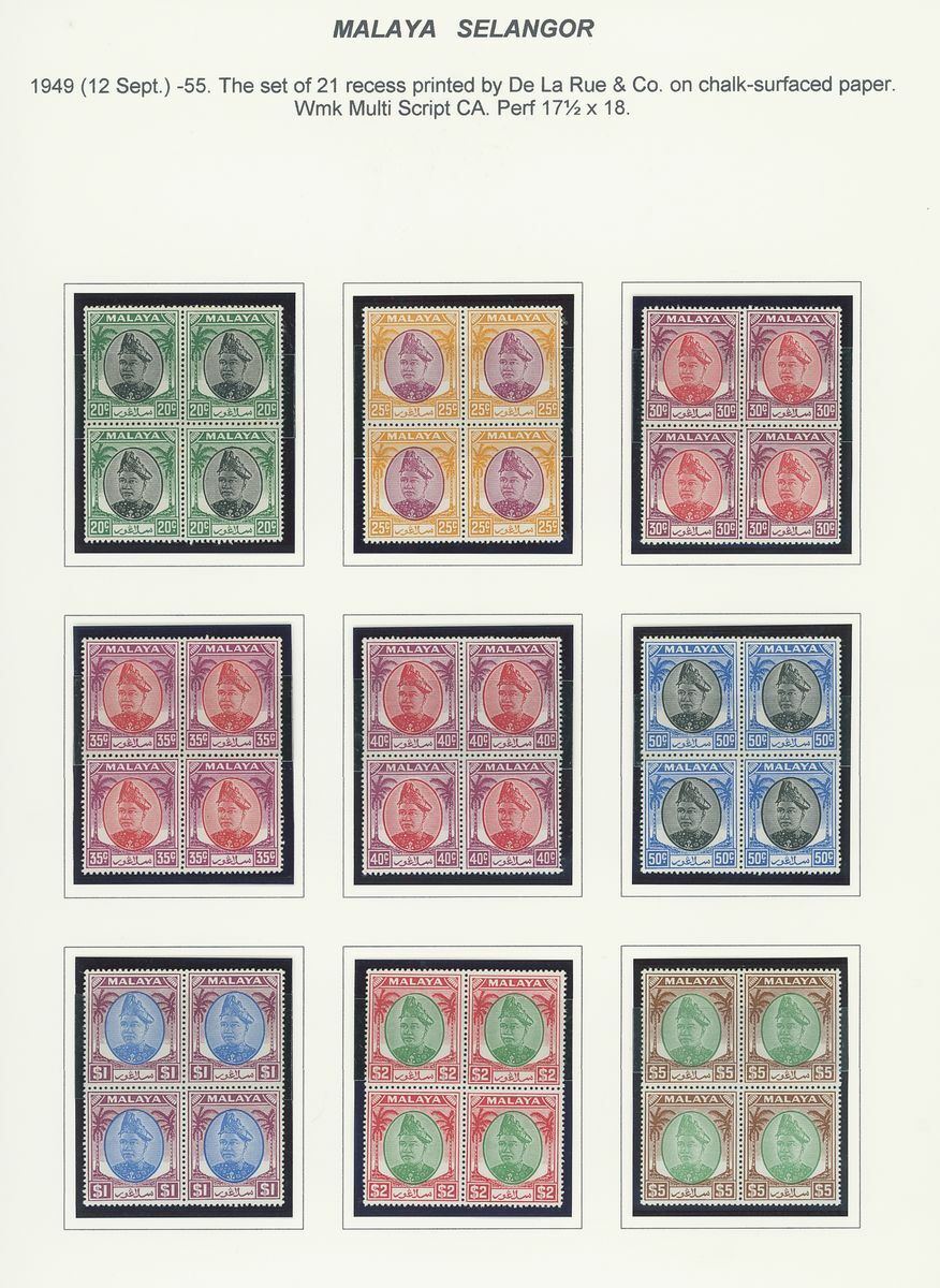 A mint group of blocks of four comprising Kedah 1957 set of eleven to $5, Negri Sembilan 1949-55 set of twenty-one to $5 and Selangor 1949-55 set to $5; all fine unmounted mint. S.G. cat. value £1,520