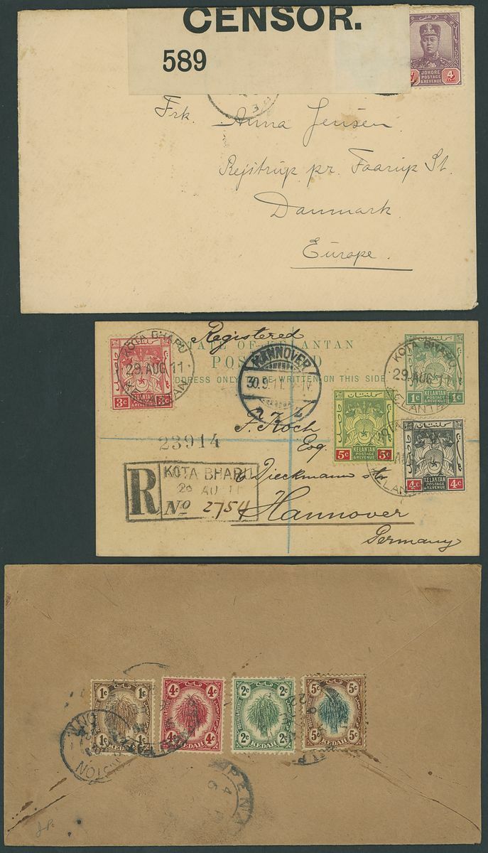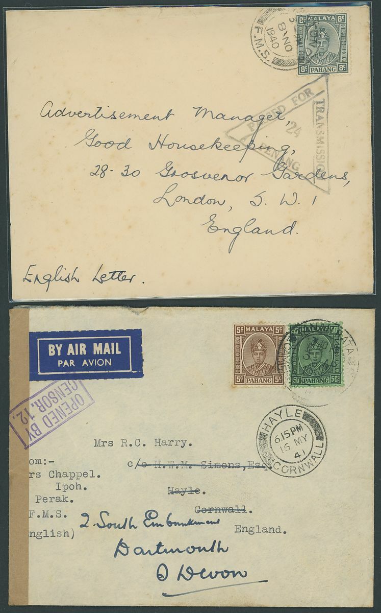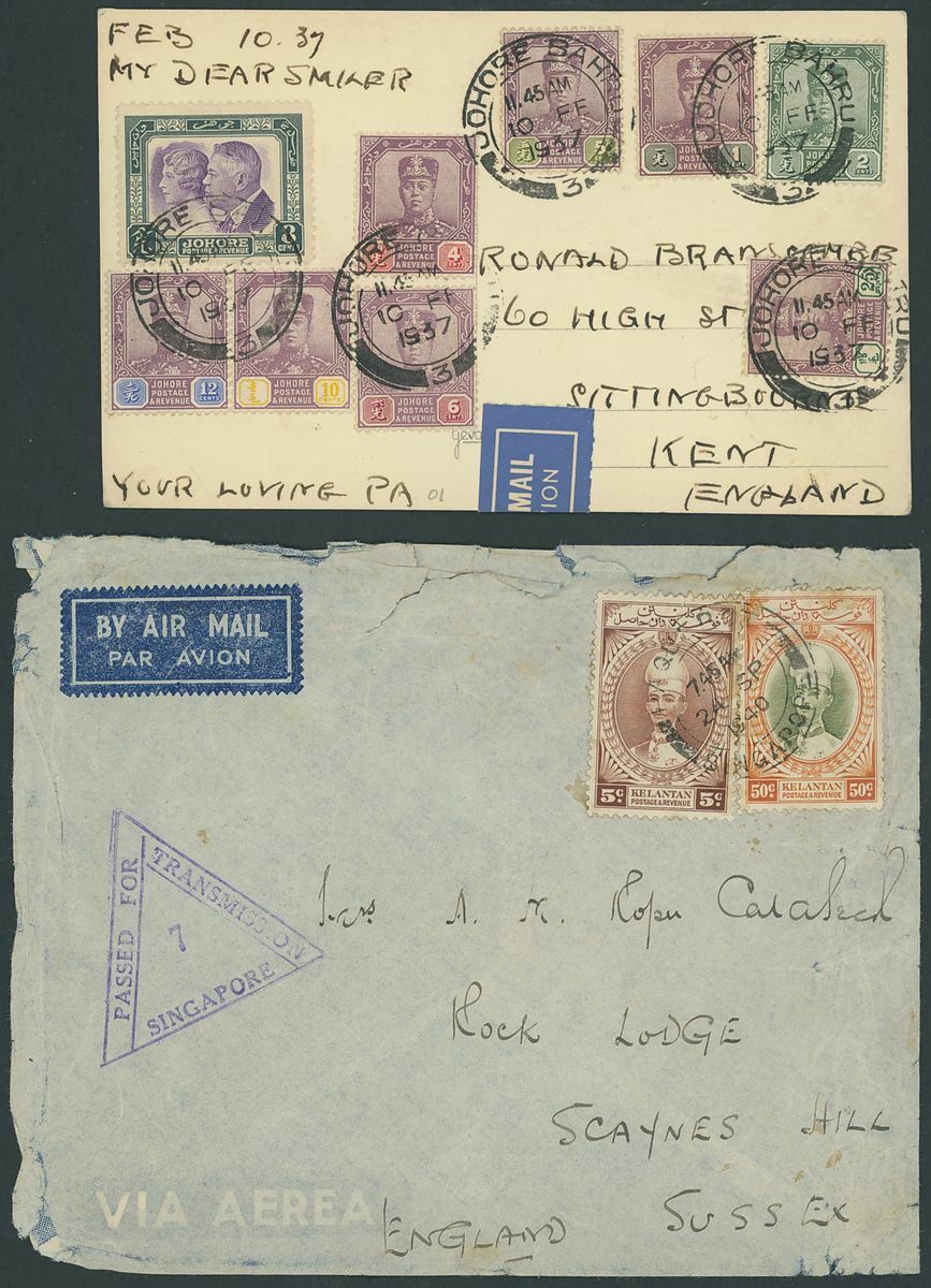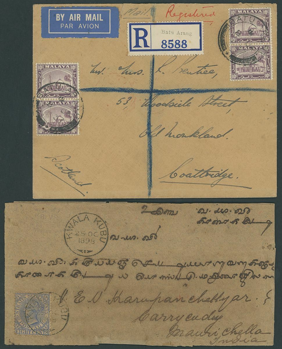 1898-1941 postal history selection (33) including Negri Sembilan 1935 envelope air mail to London bearing 1c. and 4c. (6), Selangor 1937 envelope air mail registered from Batu Arang to Scotland, 1940 Kelantan censored envelope air mail to England bearing 5c. and 50c. cancelled by