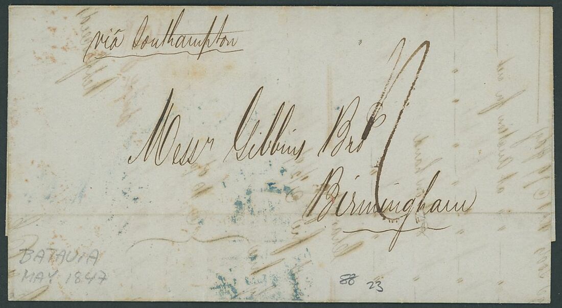 1847 (25 May) entire letter from Batavia to Birmingham, marked "via Southampton", rated "1/-" and showing, on reverse,