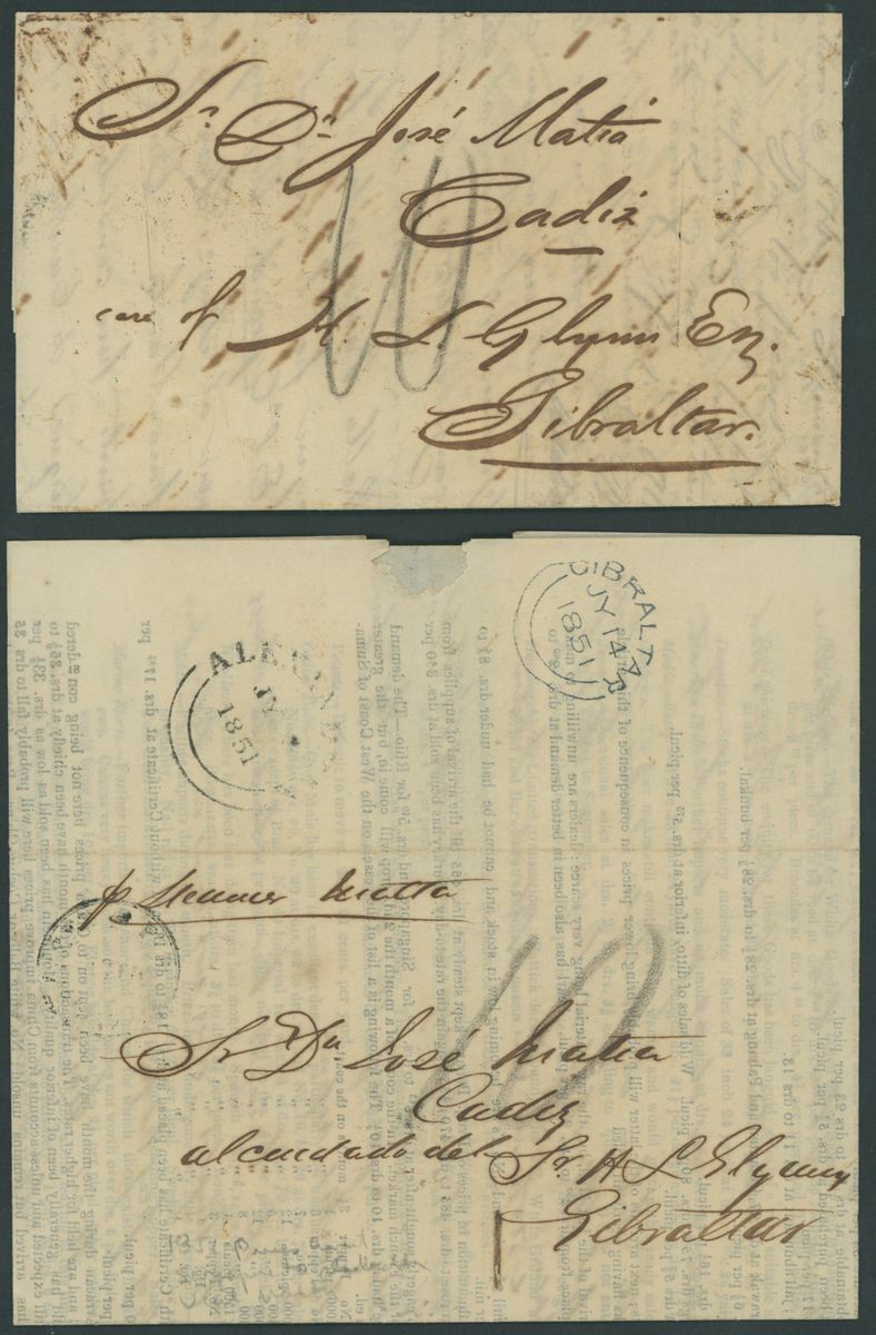 1850 (3 Aug.) entire letter with disinfection slits and 1851 (2 June) printed circular, both ex the Matia correspondence to Cadiz via Gibraltar, the former showing Alexandria British P.O. transit d.s. (9.9) and