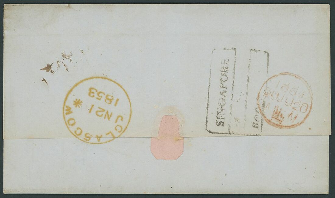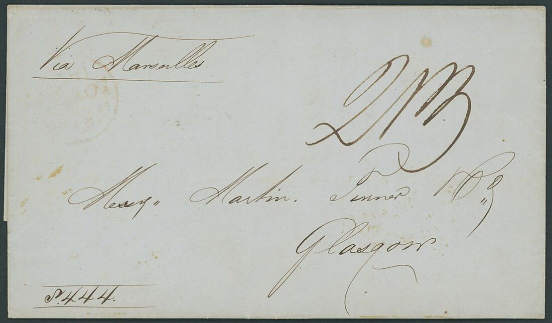 1854 (28 Apr.) entire letter to Glasgow, marked "Via Marseilles", rated "2/3" and showing, on reverse, framed