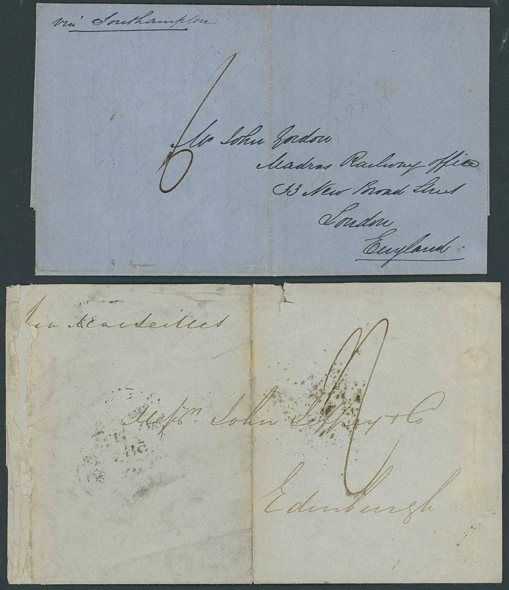 1857 (9 Sept.) entire letter from Kalang Serang, Java to London, marked "via Southampton", rated "6" and showing, on reverse, light Martin Dyce & Co. oval fac in red,