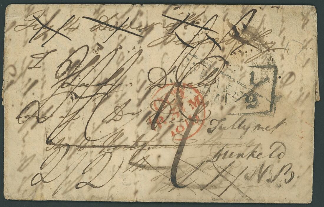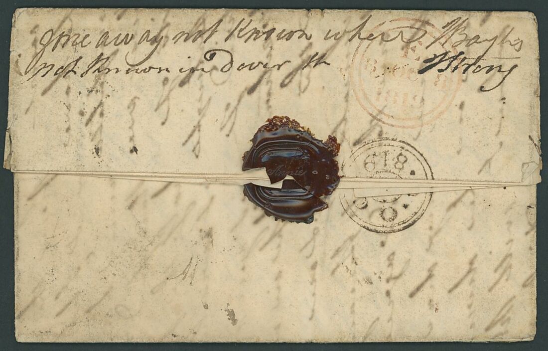 1819 (29 Mar.) letter written "on board of ' The Indiaman' at Anchor in Achin Roads" addressed to Dover, rated 2/2 via Penang and India, showing framed '