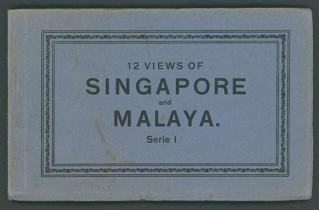 "12 Views of Singapore and Malaya, Serie I" booklet with black on blue cover by unknown publisher, one card missing, pictures include Collyer Quay, Ubad Aiah Mosque Kuala Kangsar, Boat Quay and Town Hall; condition generally fine