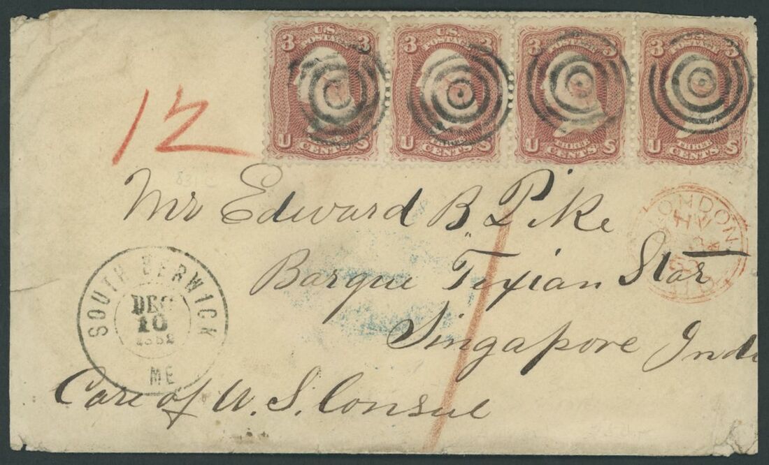 1862 envelope Care of U.S. Consul, bearing United States 1861-62 3c. rose horizontal strip of four with concentric circles cancellations, South Berwick/Me (Dec. 10) datestamp at left and red London transit datestamp, on reverse red Boston transit d.s. and blue oval Boustead & Co/Singapore forwarding agent's marking; a few minor imperfections but rare