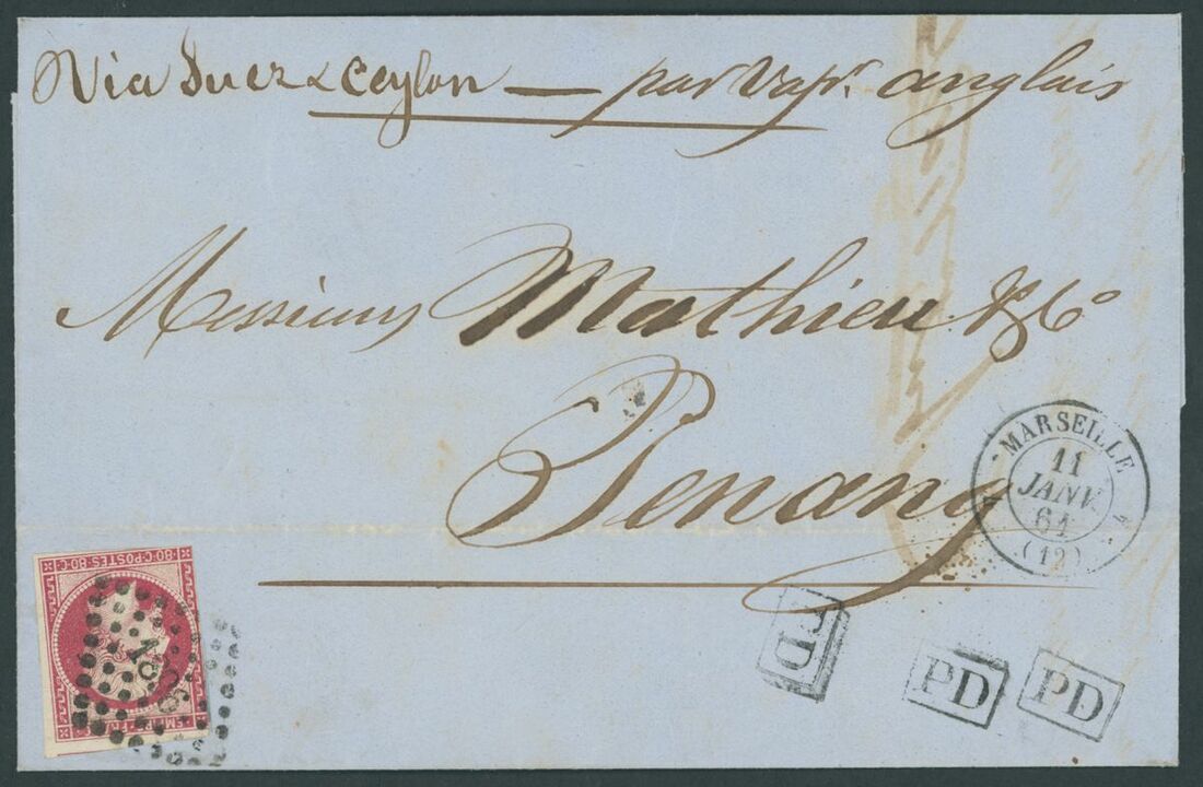 1864 (11 Jan.) entire letter from France to Penang, marked "Via Suez & Ceylon - par Vapr. anglais", bearing 1853-61 80c. (cut into to very large margins) with "1896" small figures cancellation of Marseille and showing boxed "